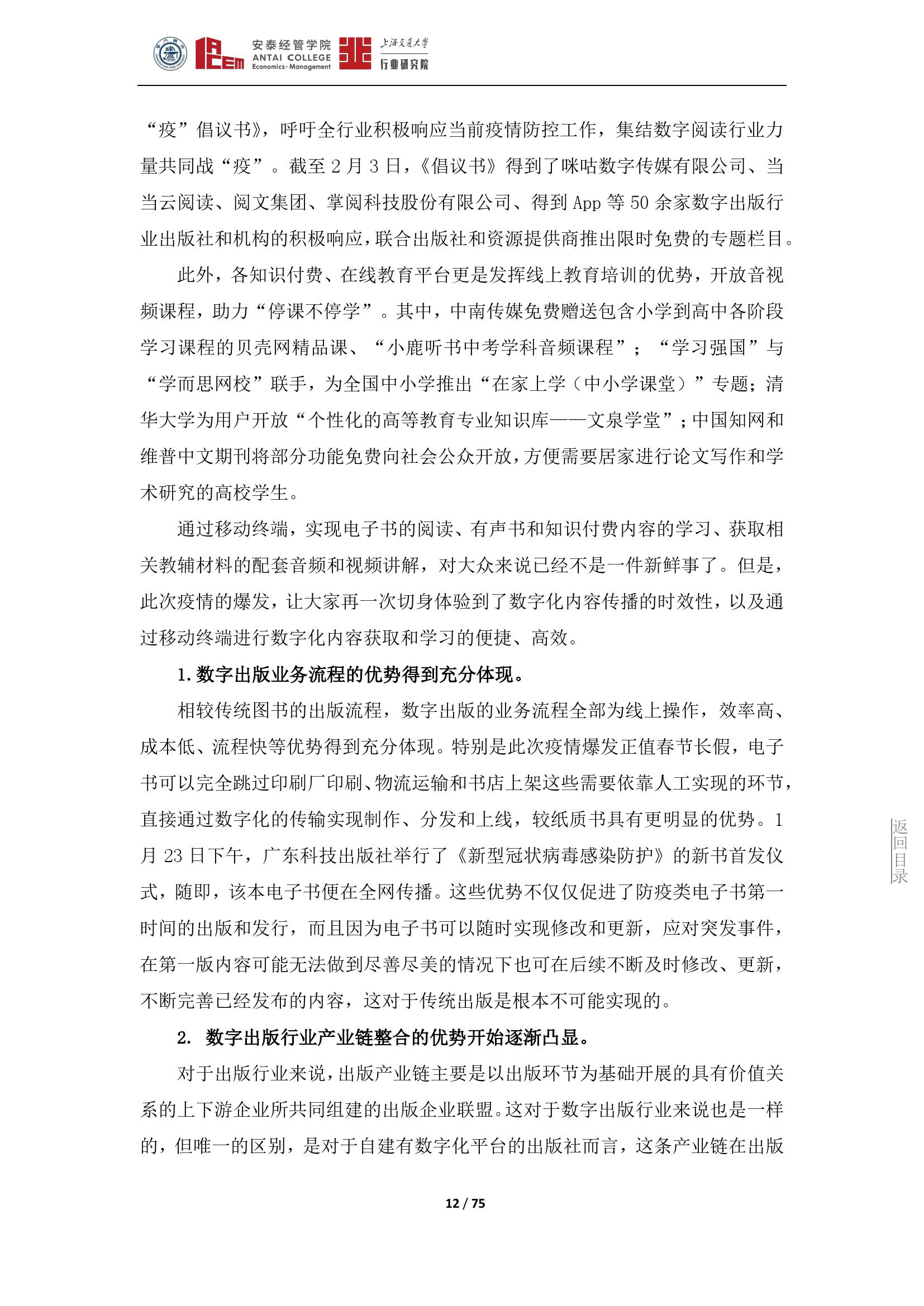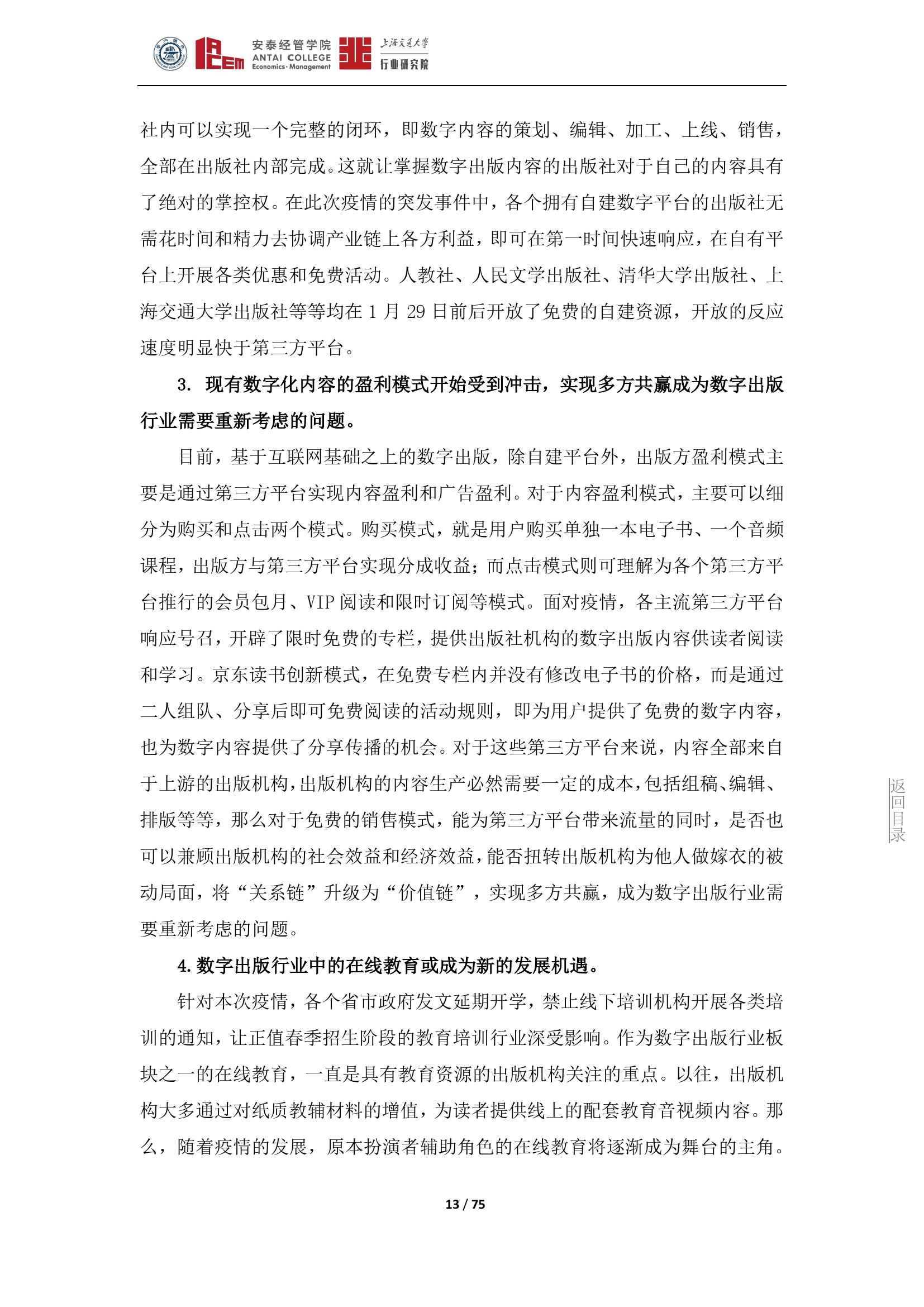 在重大突发公共事件的背景下,进一步凸显了数字出版行业的优势。未来,对于数字出版业来说,必须要在充分了解、顺应读者阅读方式的基础上继续培养读者的阅读和使用习惯,进一步培育和拓展数字出版行业市场,在激烈的市场竞争中继续保持核心的内容竞争力,实现数字出版行业的快速发展。