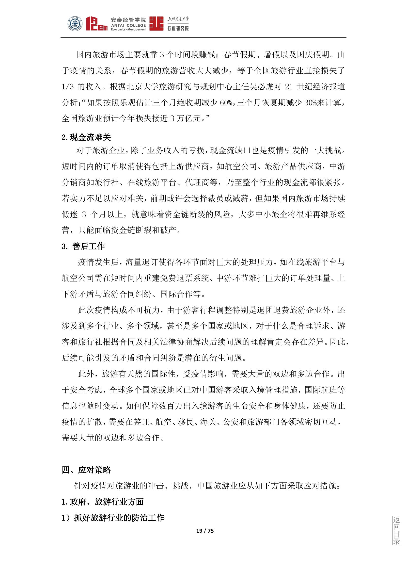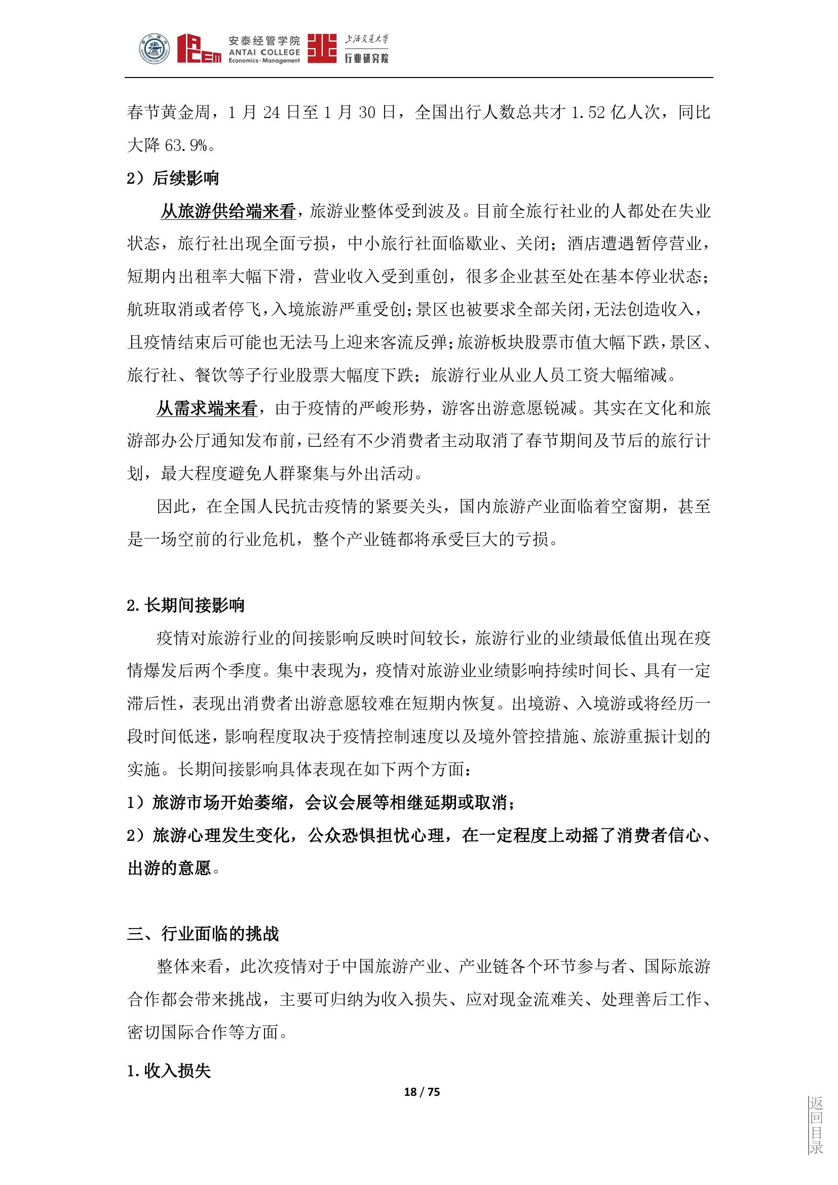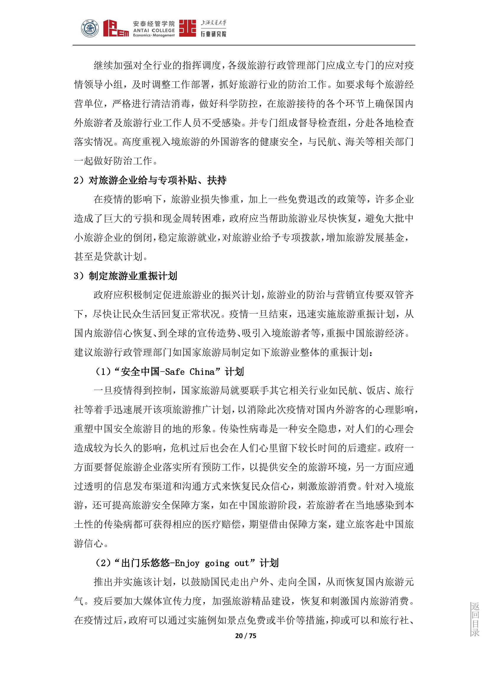 旅游产业是一个高度环境敏感性行业,这种敏感表现在非常容易遭受境内外突发事件的冲击和影响,从而导致严重的衰退和滑坡,形成旅游危机。此次疫情对旅游行业构成了全面的冲击。上海交大行业研究院旅游行业研究团队从政府和旅游企业两个层面提出应对措施,以应对此次疫情的冲击和挑战。