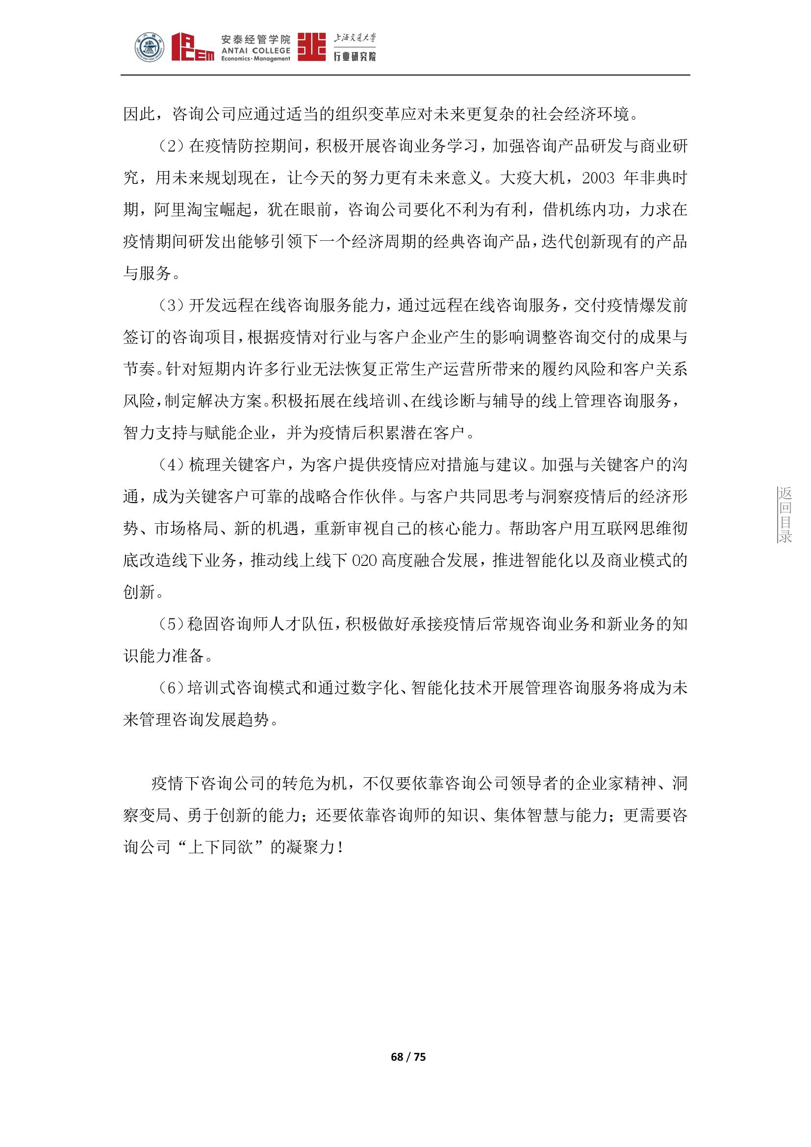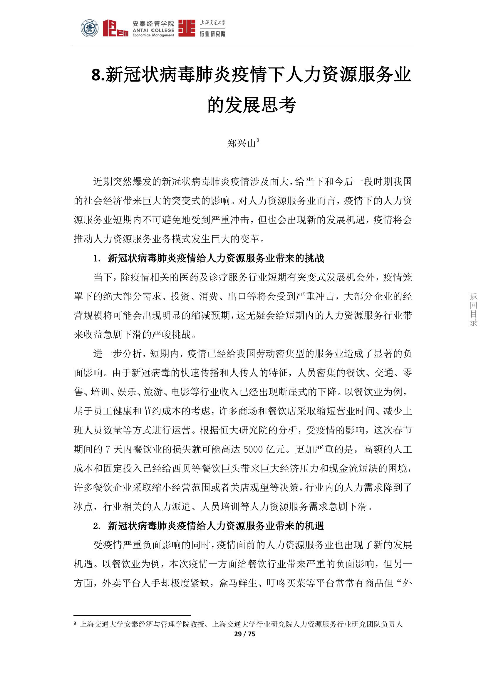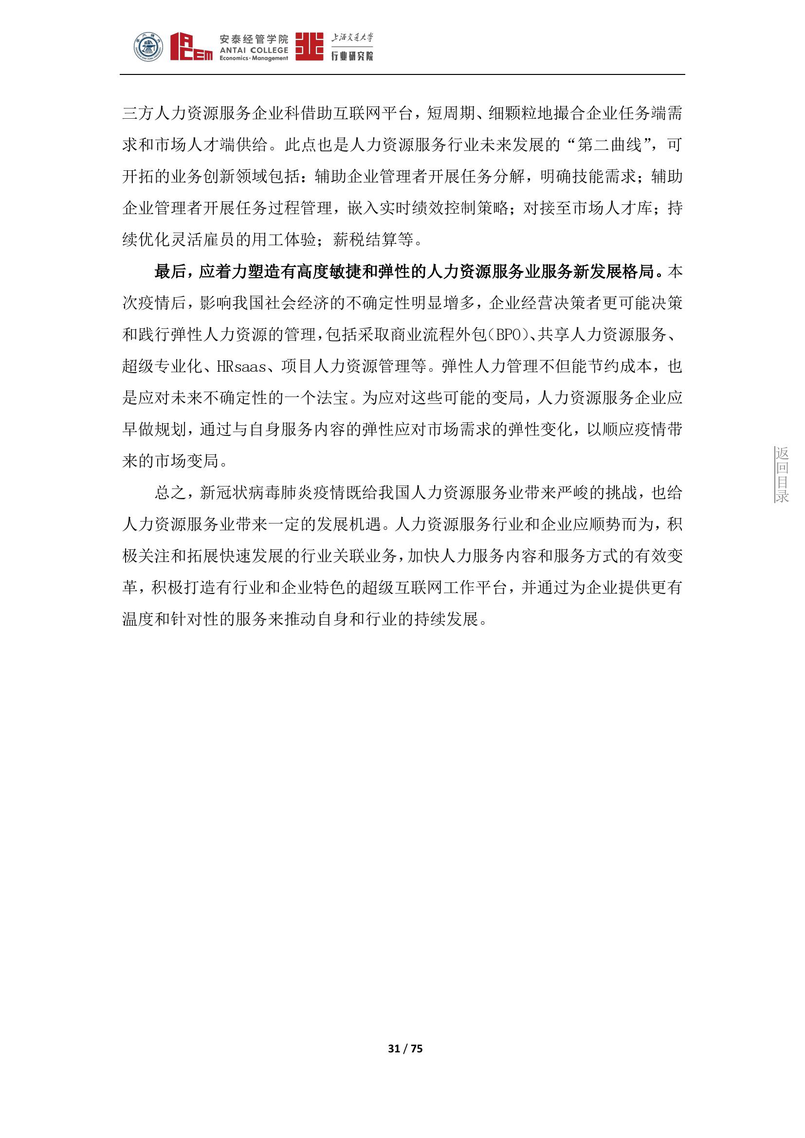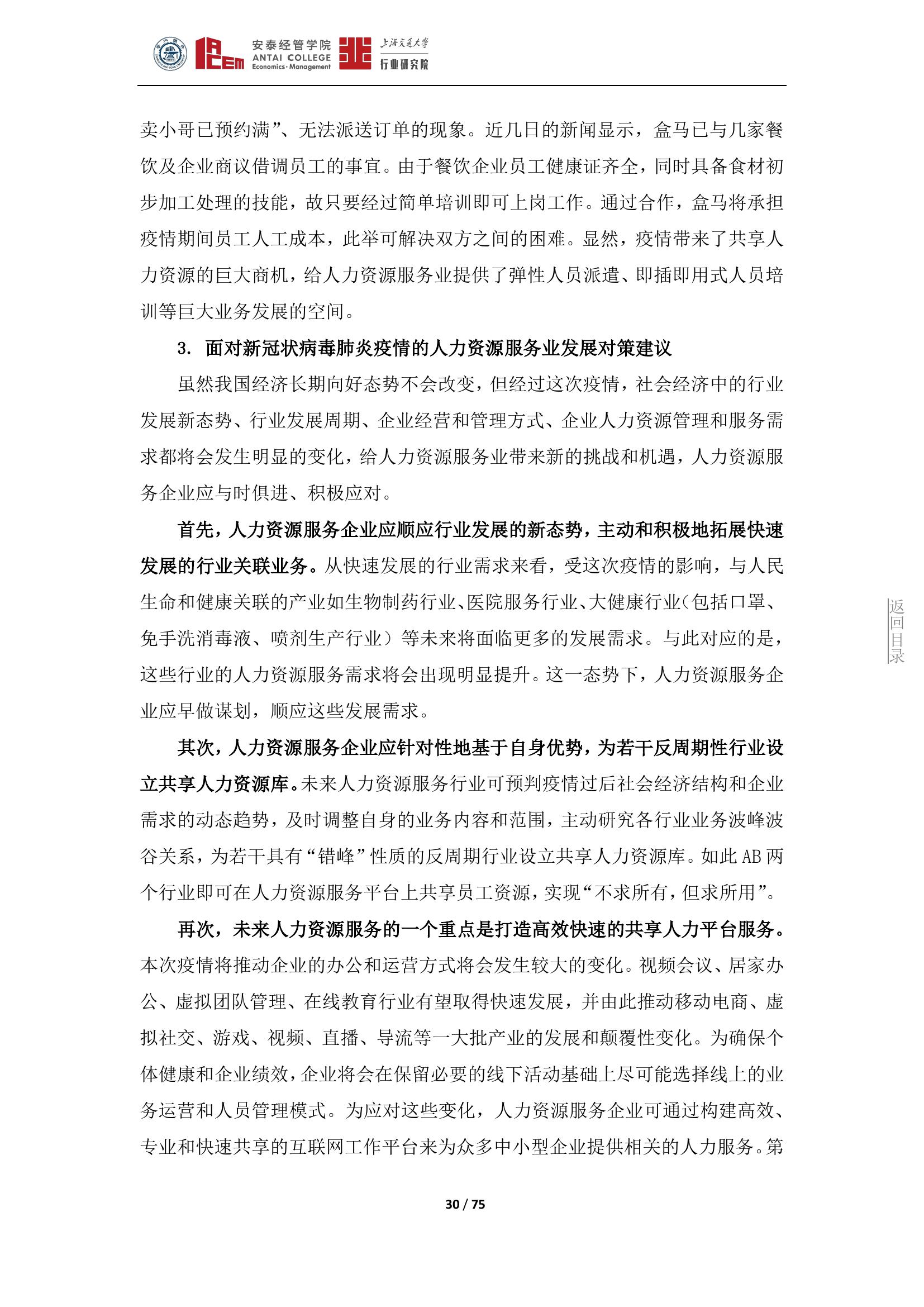 冠状病毒肺炎疫情给我国人力资源服务业带来了严峻的挑战与发展机遇,企业应顺势而为,积极关注和拓展快速发展的行业关联业务,加快人力服务内容和服务方式的有效变革,积极打造有行业和企业特色的超级互联网工作平台,通过为企业提供更有温度和针对性的服务来推动自身和行业的持续发展。