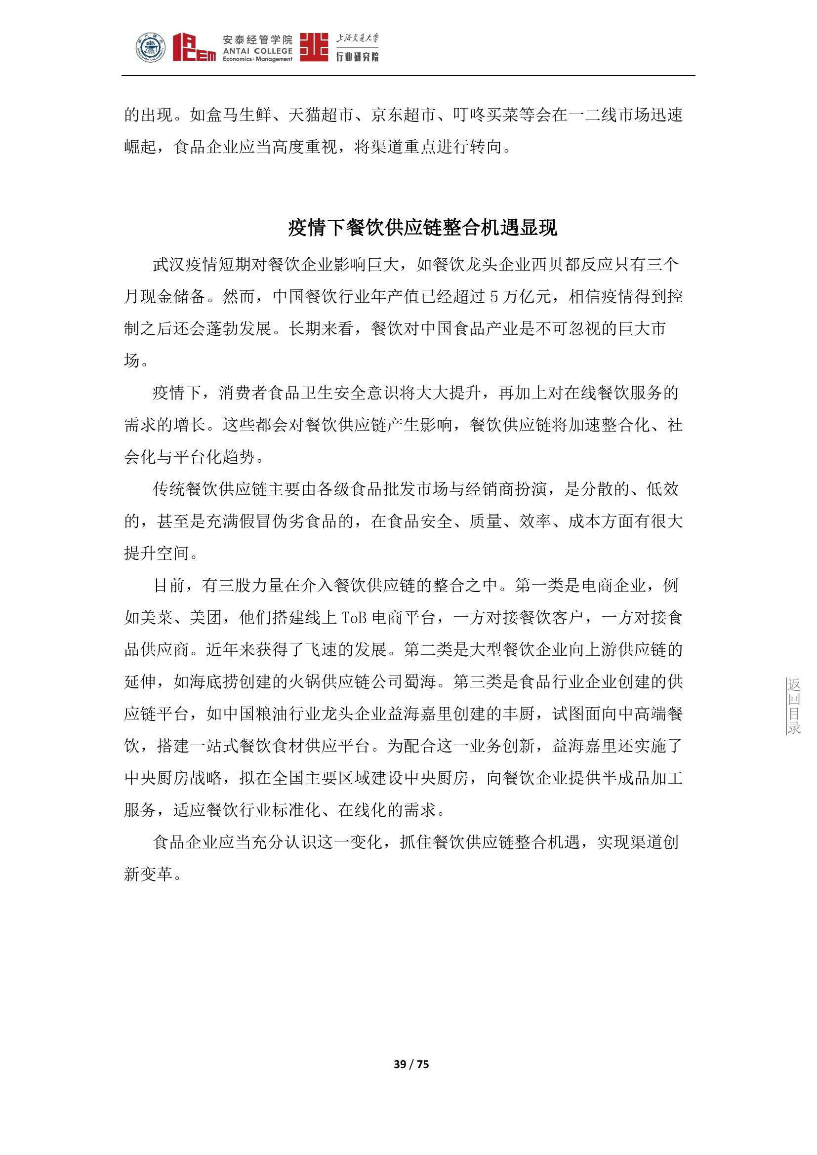 疫情的出现将对线下商超的生意产生重大影响,进一步打压线下食品零售场景,倒逼食品类电商以及新零售的出现;如盒马生鲜、天猫超市、京东超市、叮咚买菜等会在一二线市场迅速崛起,食品企业应当高度重视,将渠道重点进行转向。