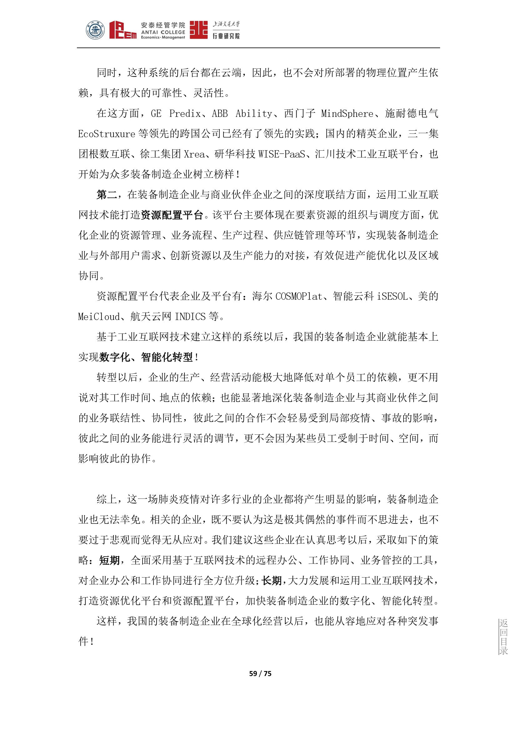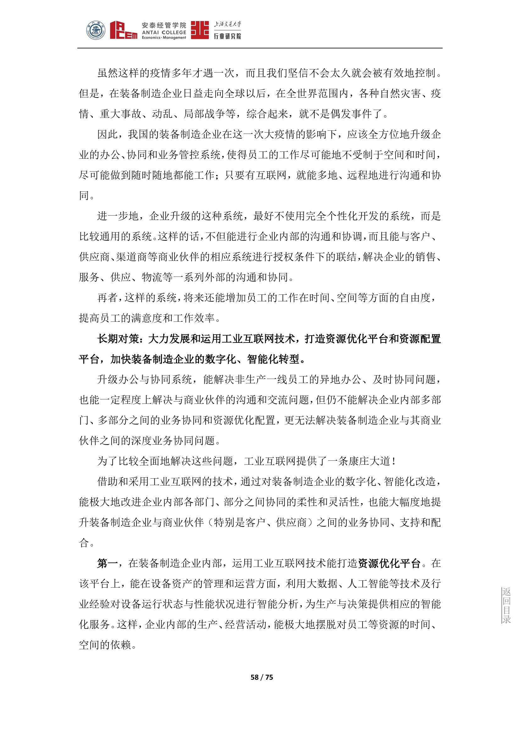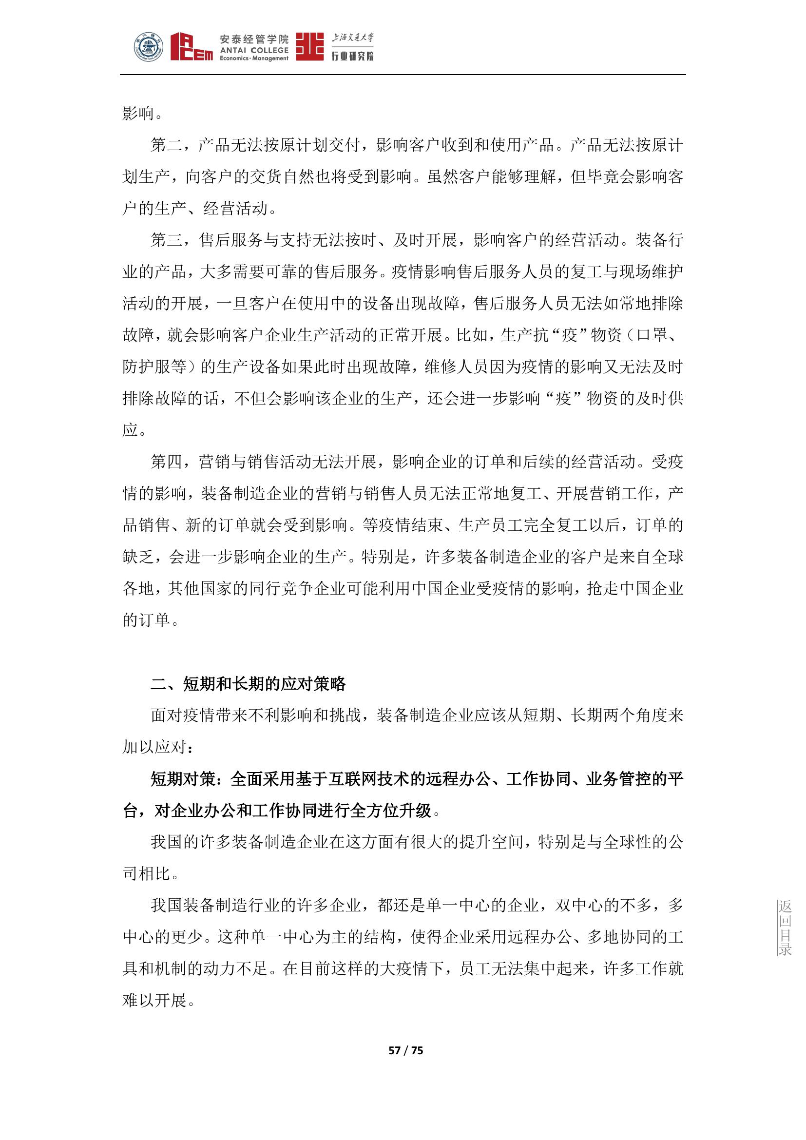面对疫情带来的不利影响和挑战,装备制造企业应该从短期、长期两个角度来加以应对。短期,全面采用基于互联网技术的远程办公、工作协同、业务管控的工具,对企业办公和工作协同进行全方位升级;长期,大力发展和运用工业互联网技术,打造资源优化平台和资源配置平台,加快装备制造企业的数字化、智能化转型。