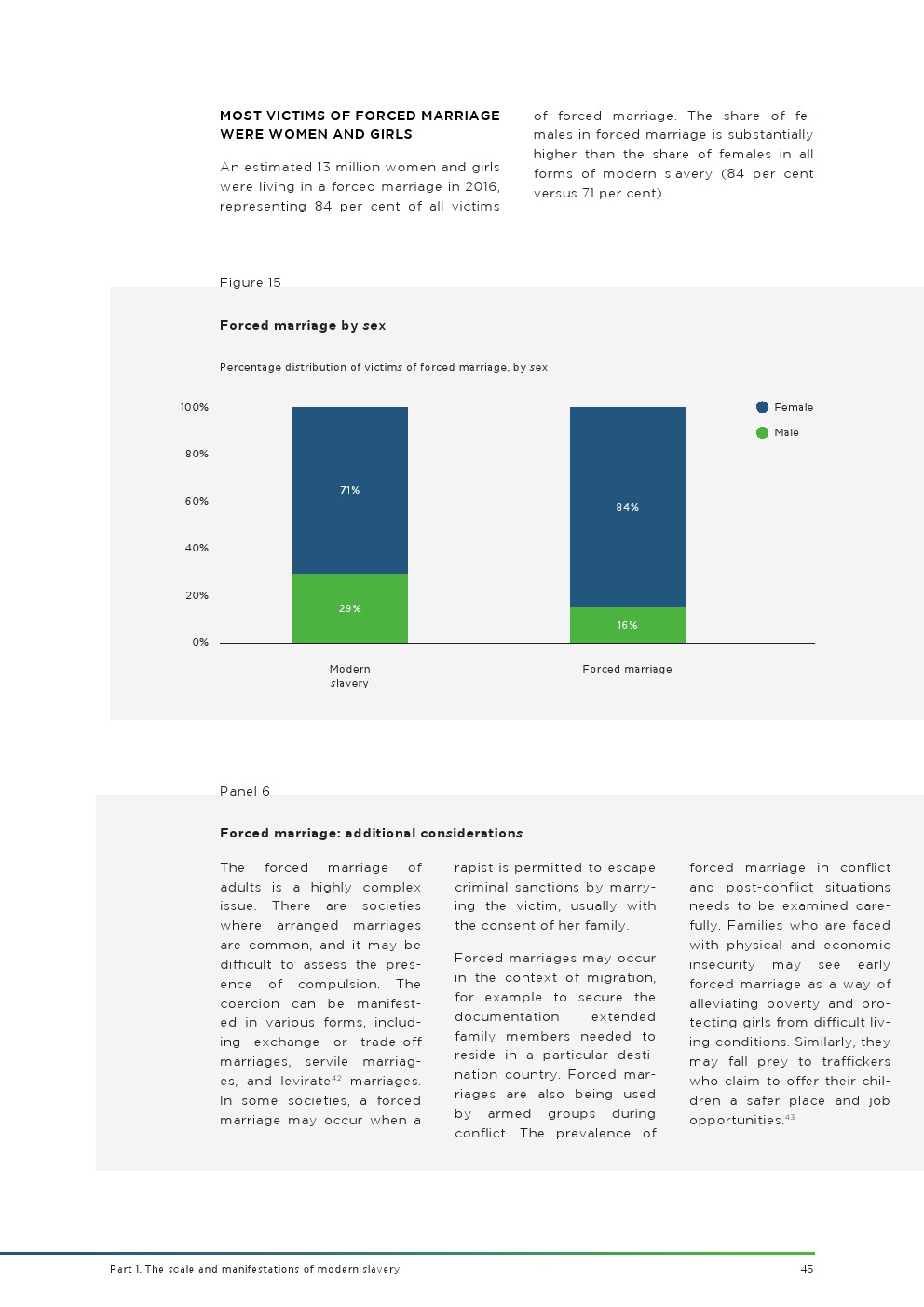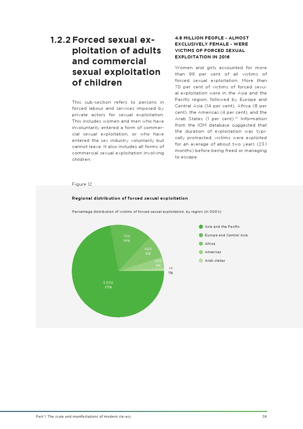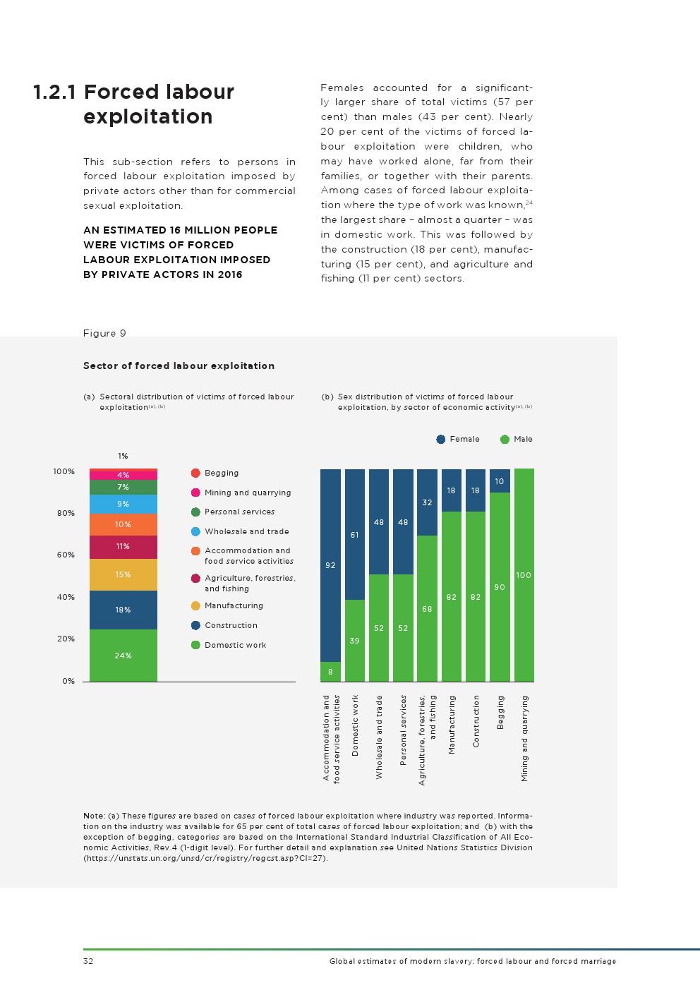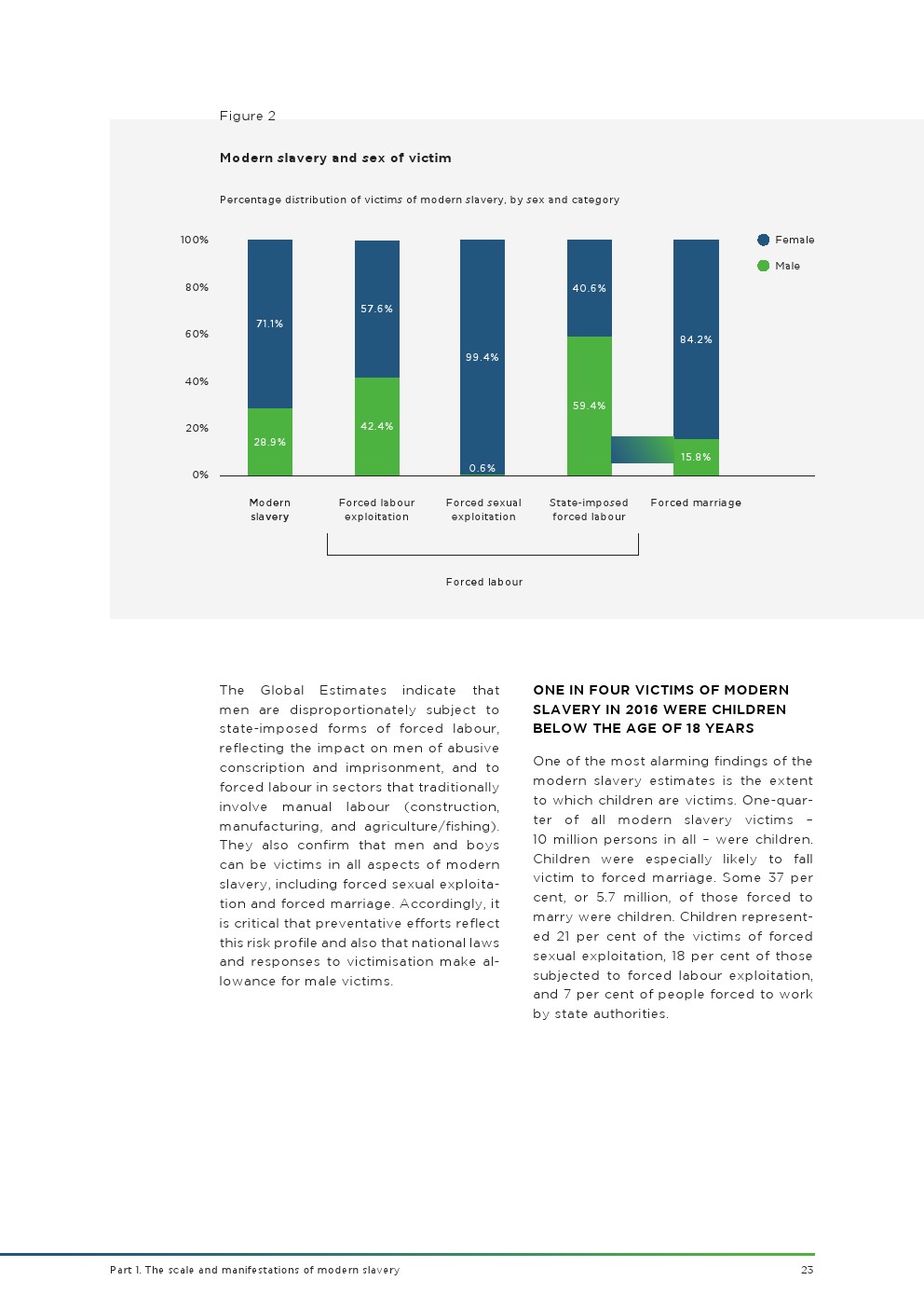 妇女和女童不成比例地受到现代奴隶制的影响,占总数的71%,即2870万人。更确切地说,妇女和女童占商业性行业强迫劳动受害者的99%,占其他行业强迫劳动受害者的58%,占国家当局强迫劳动受害者的40%,占强迫婚姻受害者的84%。