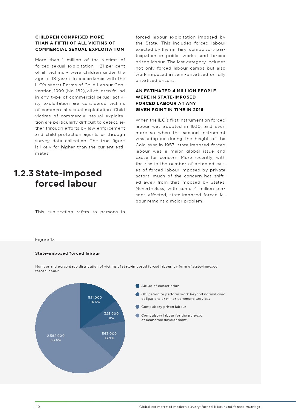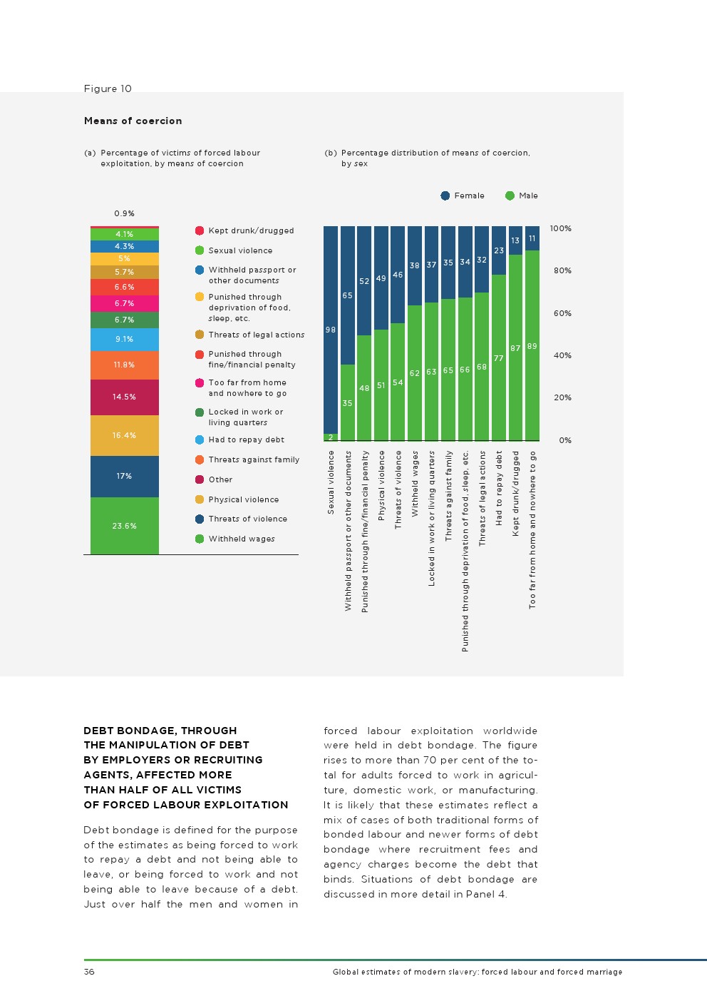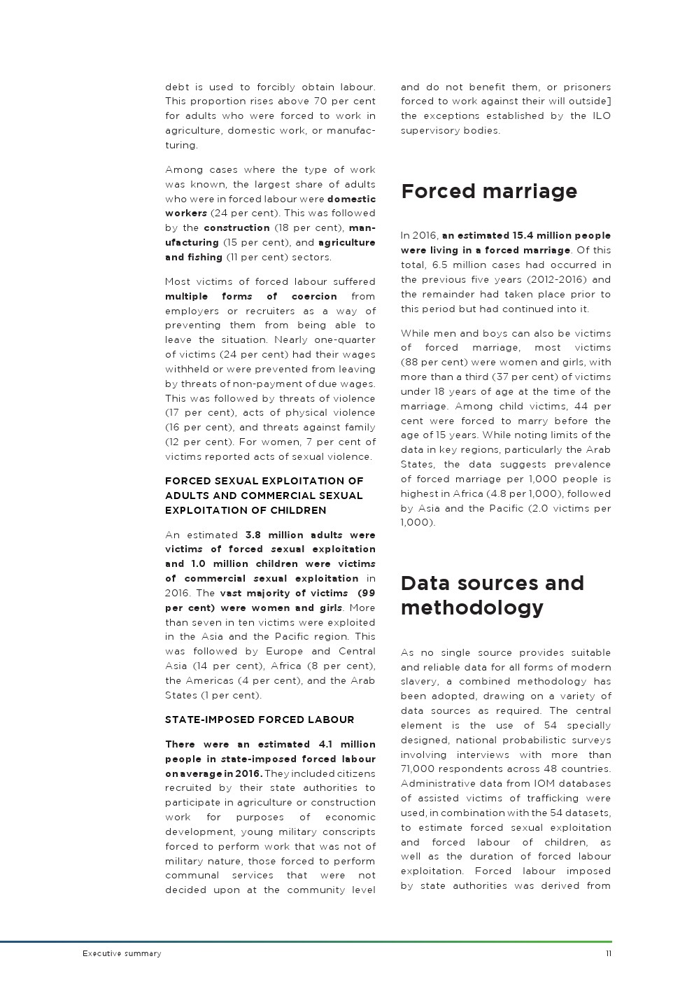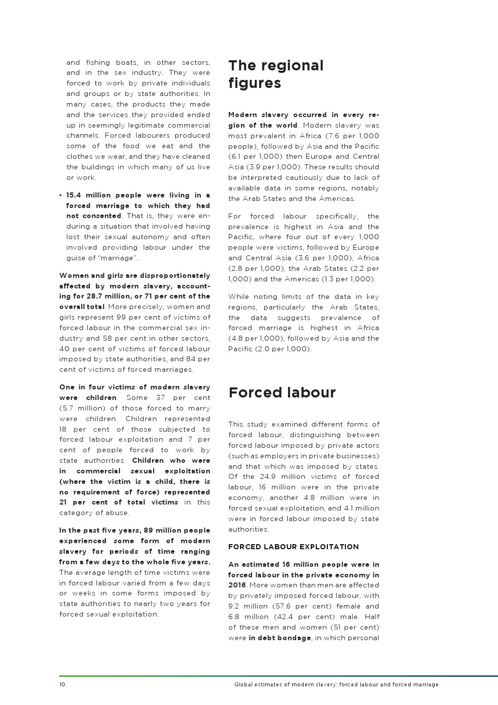 妇女和女童不成比例地受到现代奴隶制的影响,占总数的71%,即2870万人。更确切地说,妇女和女童占商业性行业强迫劳动受害者的99%,占其他行业强迫劳动受害者的58%,占国家当局强迫劳动受害者的40%,占强迫婚姻受害者的84%。