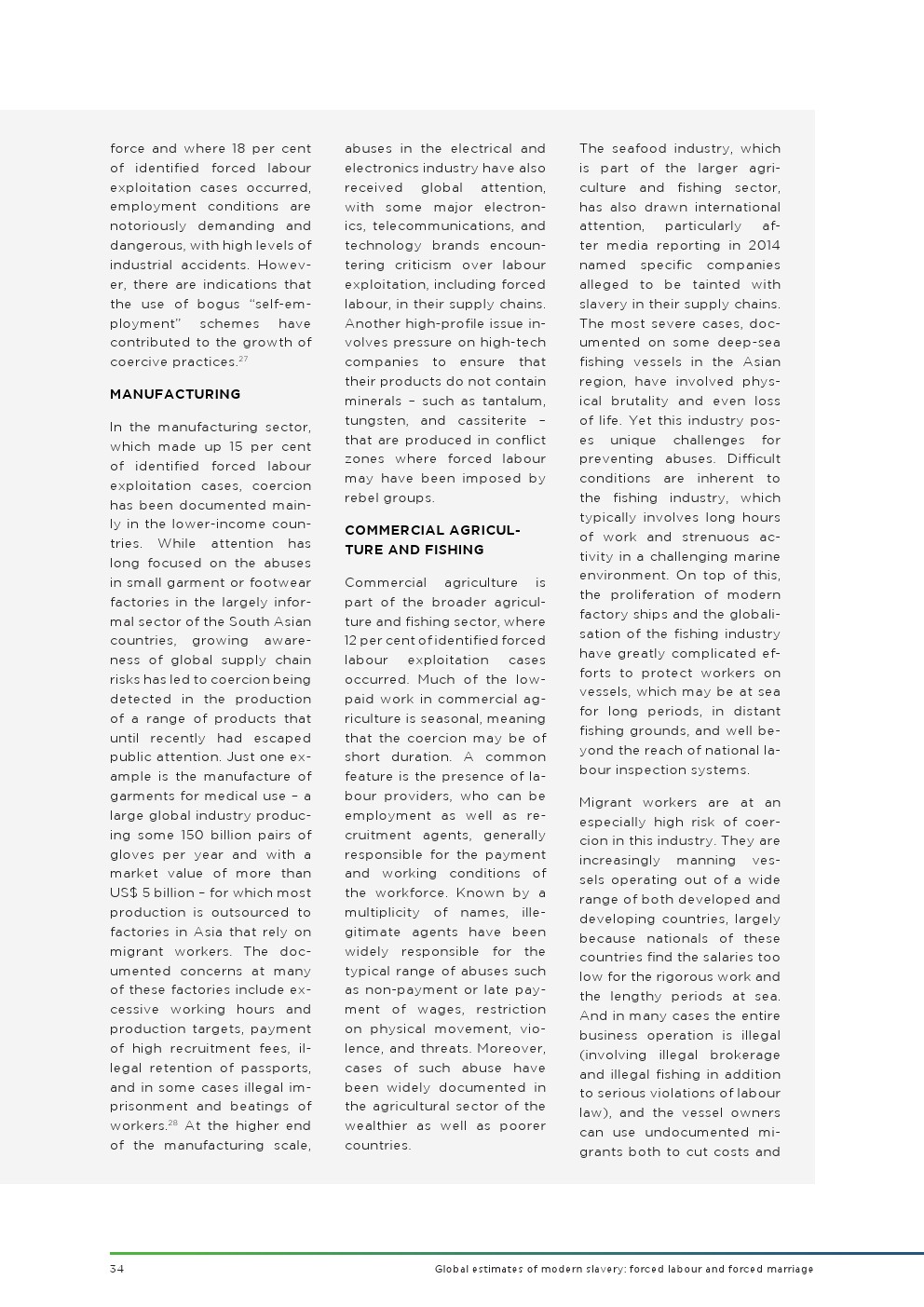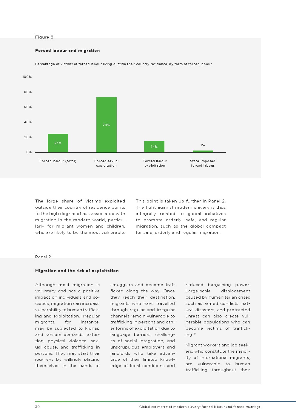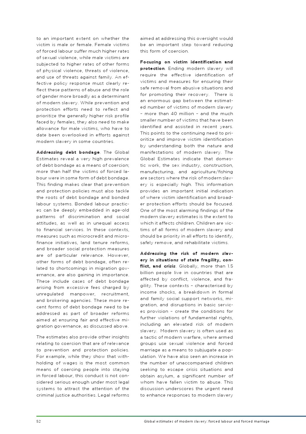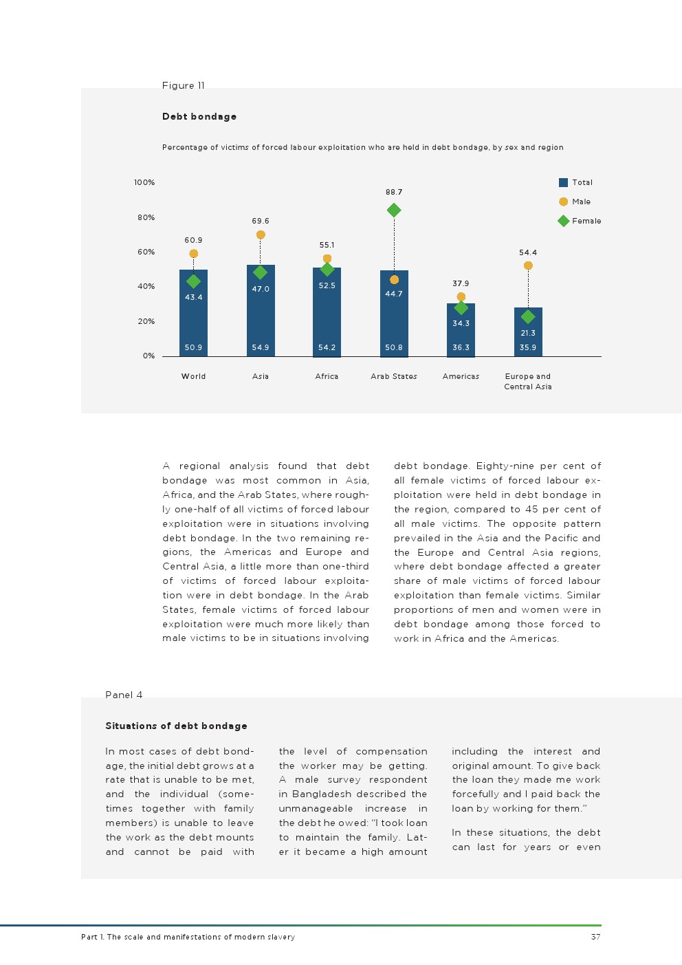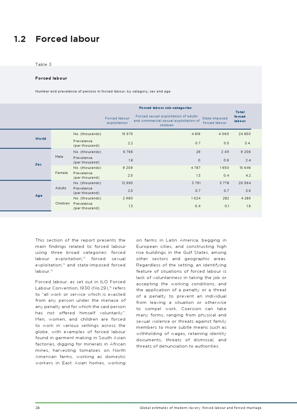 妇女和女童不成比例地受到现代奴隶制的影响,占总数的71%,即2870万人。更确切地说,妇女和女童占商业性行业强迫劳动受害者的99%,占其他行业强迫劳动受害者的58%,占国家当局强迫劳动受害者的40%,占强迫婚姻受害者的84%。