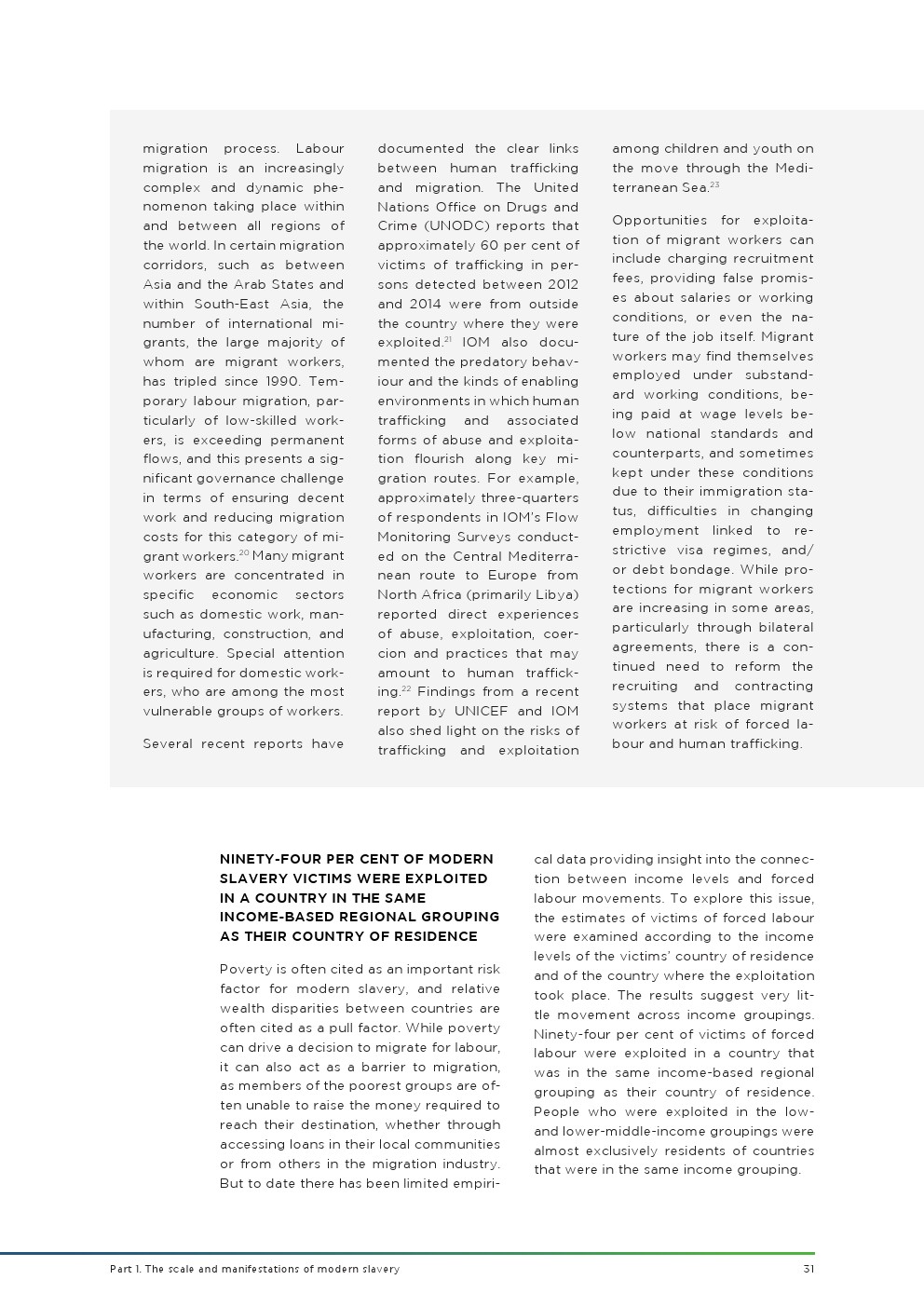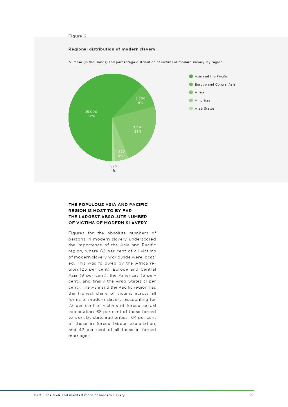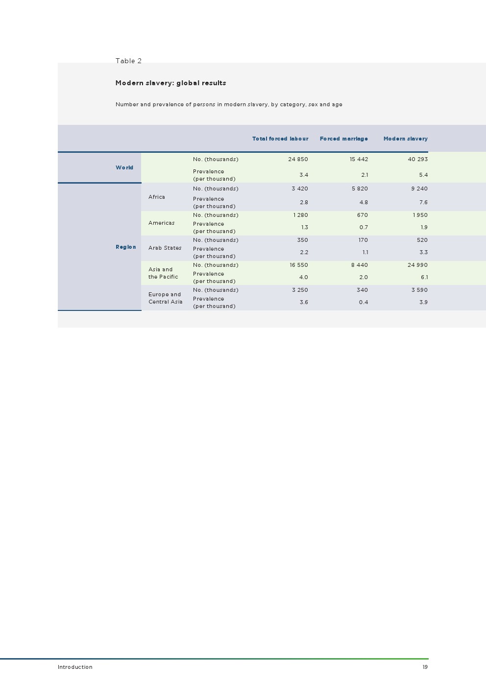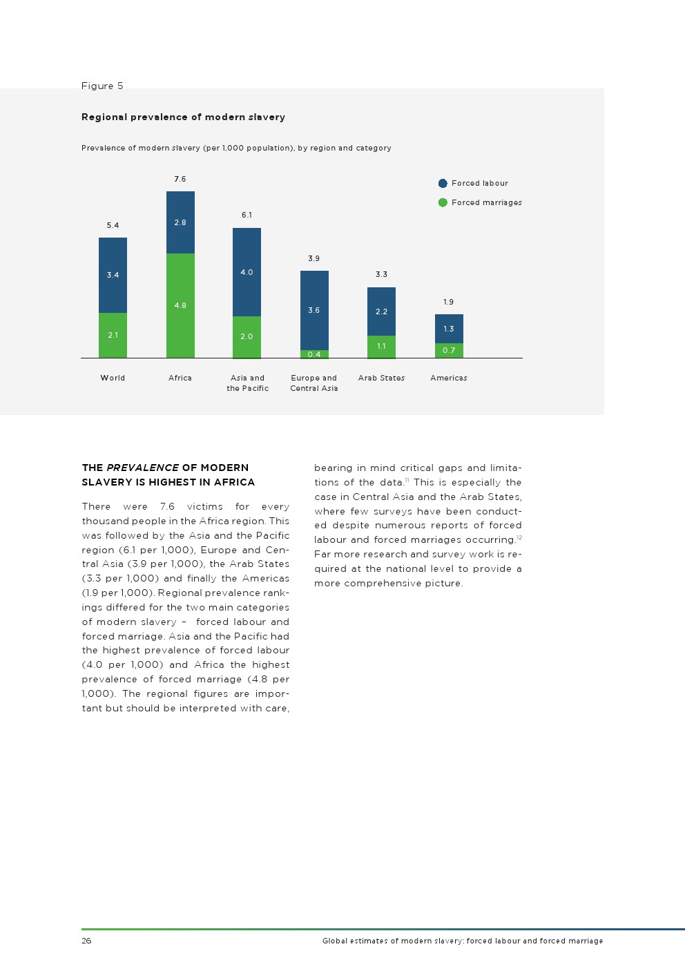 现代奴隶制在非洲最为普遍(7.6‰),其次是亚洲和太平洋地区(6.1‰),然后是欧洲和中亚(3.9‰),阿拉伯国家和美洲缺乏可用数据。