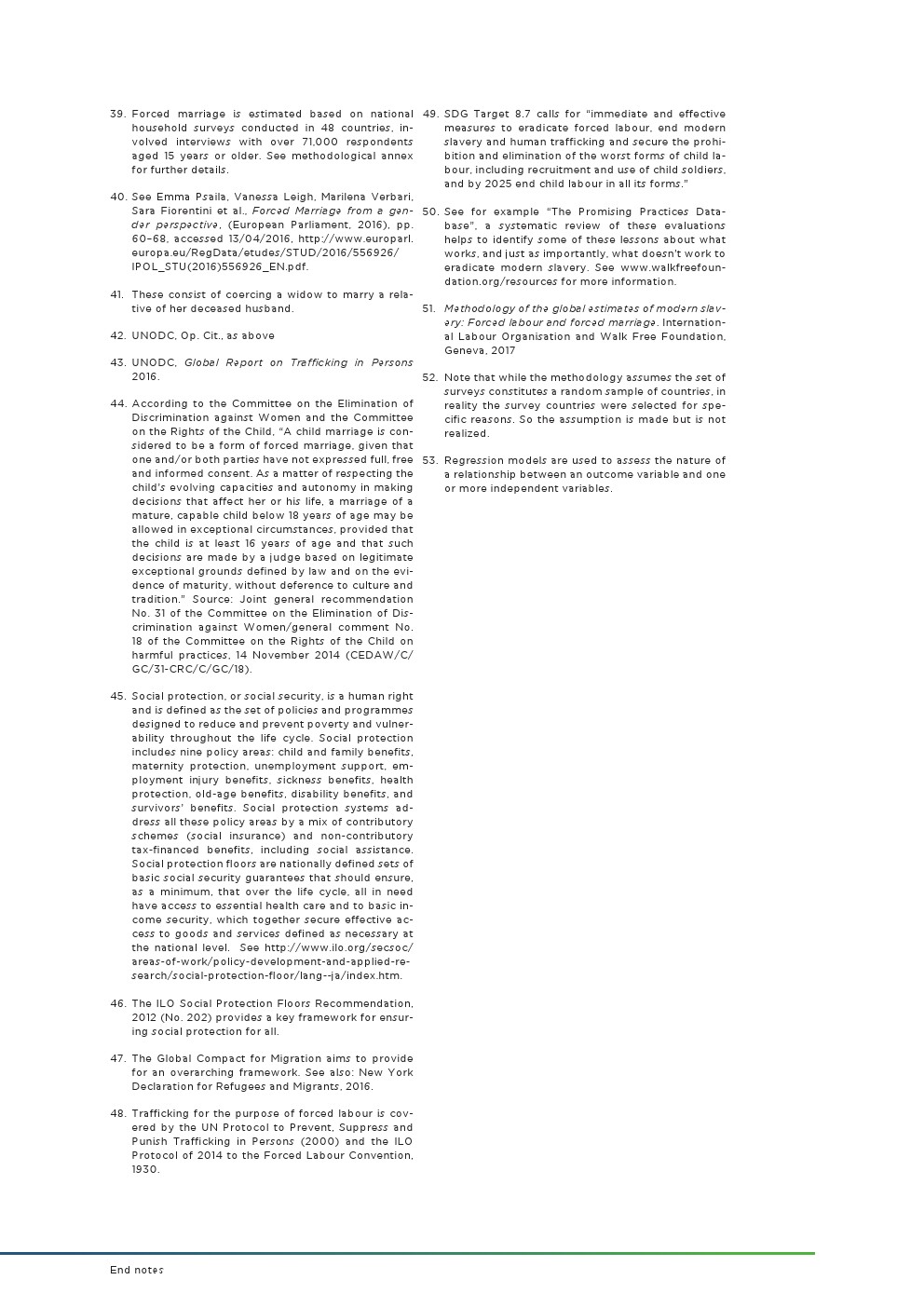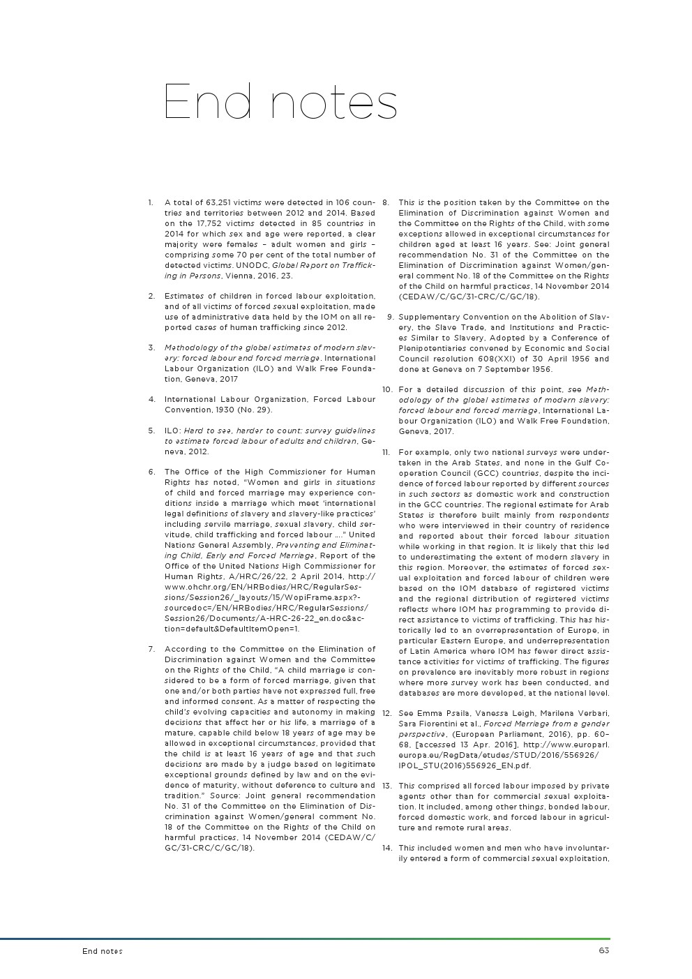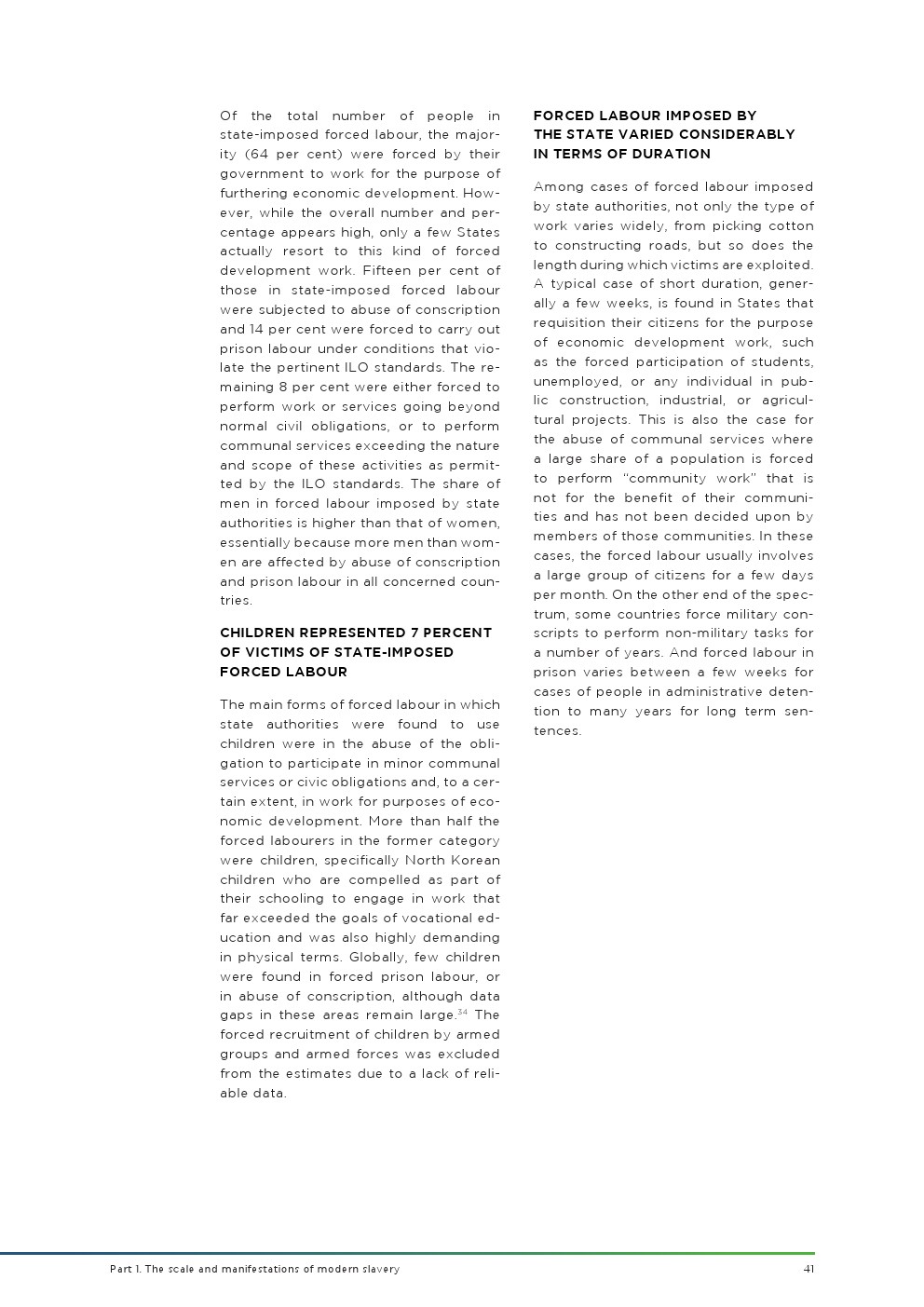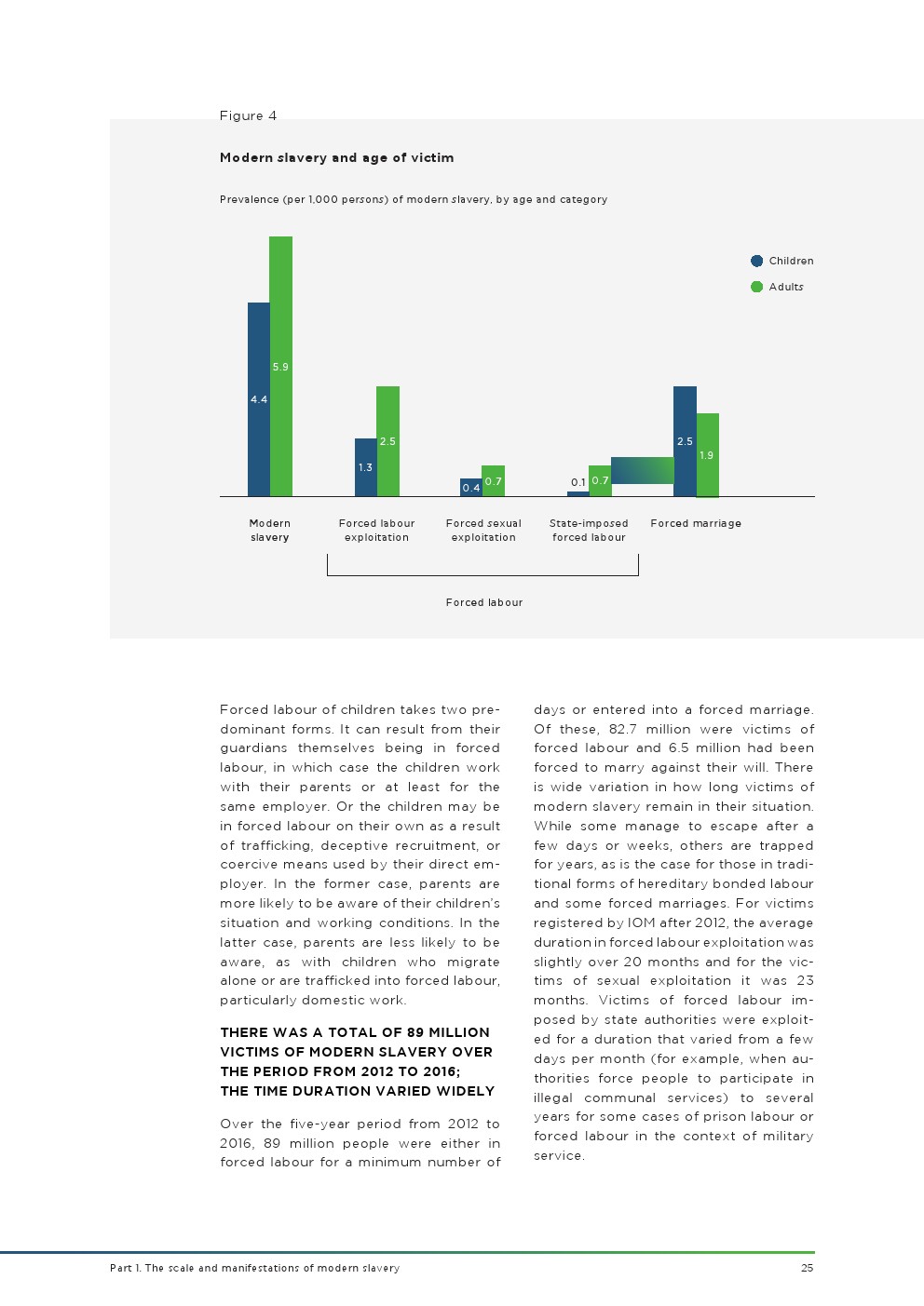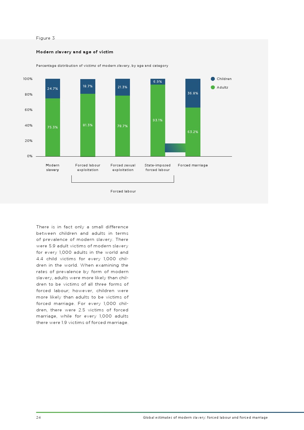 现代奴隶制1/4的受害者是儿童。在被迫结婚的人中约有37%是儿童(570万)。儿童占被强迫劳动剥削的人口的18%,占国家当局强迫工作的人口的7%。处于商业性剥削中的儿童占21%。