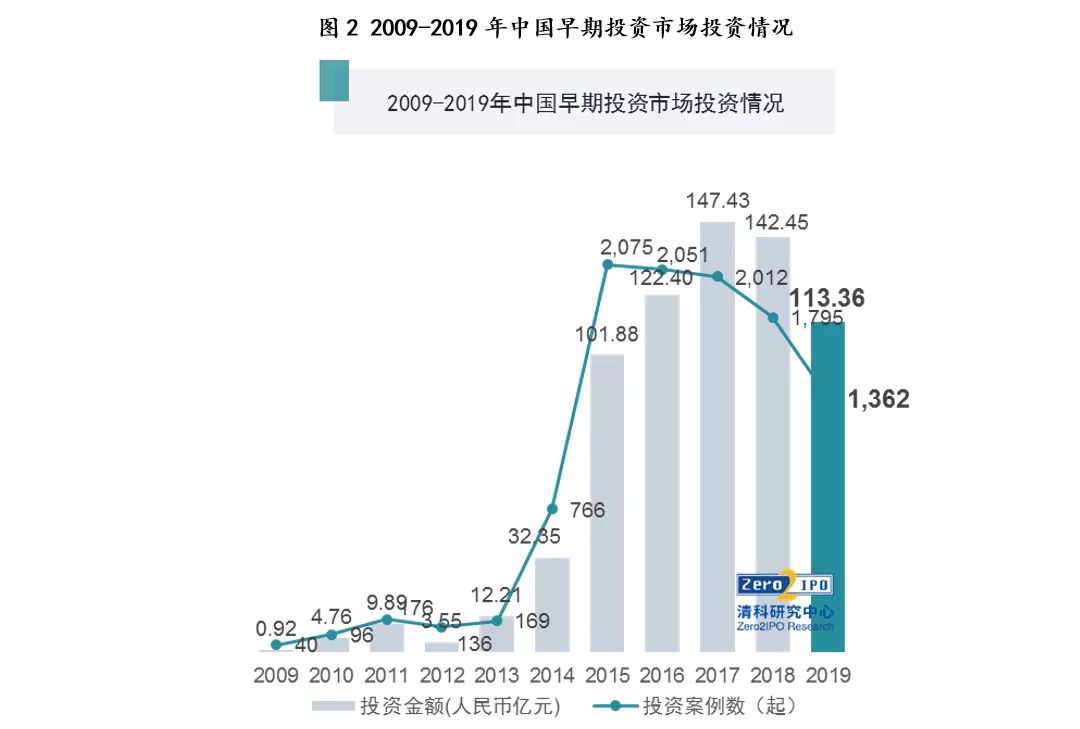 从早期、VC、PE市场来看,2019年早期市场投资案例数为1,362起,投资金额为113.36亿元;VC市场投资案例数为3,455起,投资金额为1,577.80亿元;PE市场投资案例数为3,417起,投资金额为5,939.78亿元。相较而言,早期市场投资案例数降幅最大,同比下降24.1%,活跃度不足;而PE市场因部分行业估值下调,大额投资案例减少,投资总金额同比下降最多,高达30.3%。