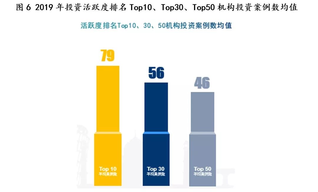 从机构角度分析,活跃度排名TOP10、TOP30和TOP50机构的平均投资案例数分别为79起、56起和46起,活跃机构的投资案例数均值较去年同期有所下降,但下降幅度小于全市场的17.8%。VC机构的投资活跃度普遍较高,分市场看,2019年最活跃的早期、VC、PE代表机构有真格基金、红杉、深创投、腾讯等。