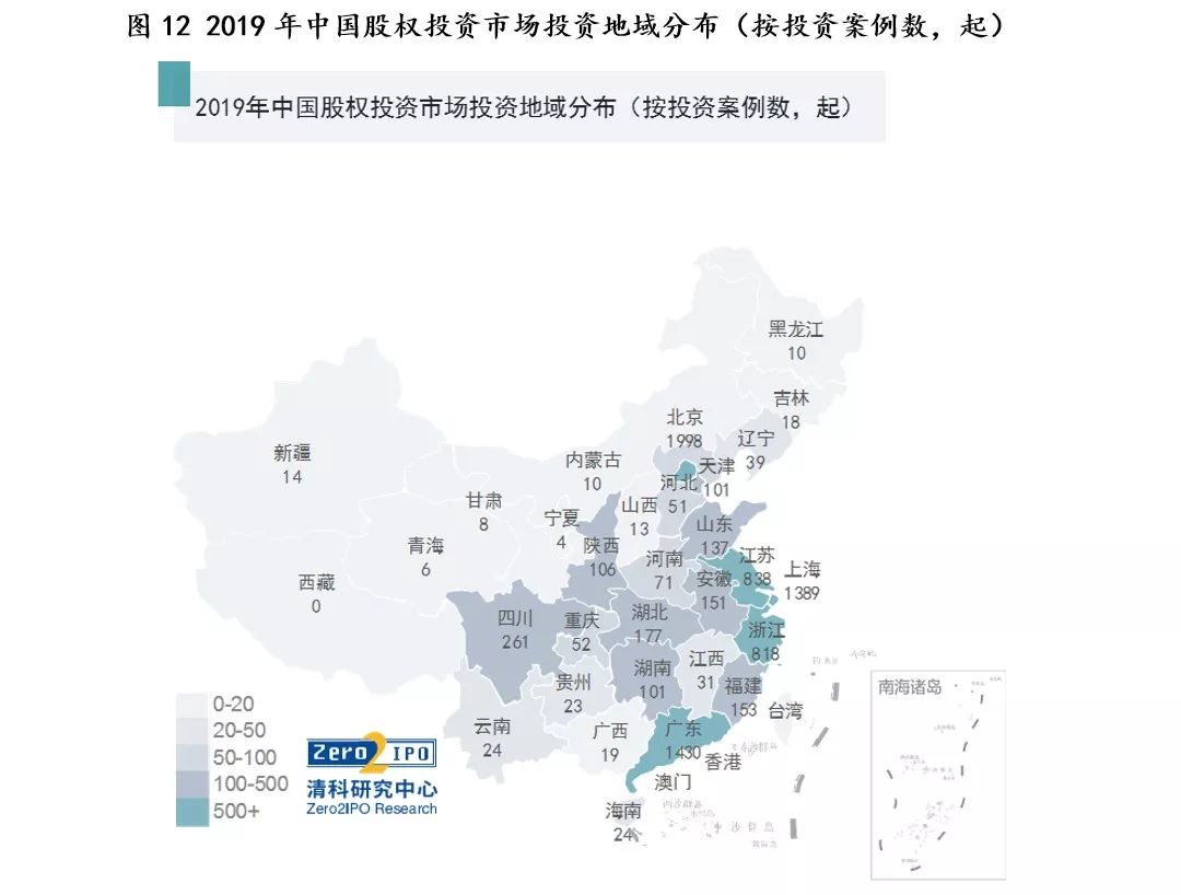 2019年北京、上海、深圳的股权投资活跃度仍然排名前三,投资案例数分别为1,998起、1,389起、902起,但投资集中度略有下降。从实有企业数量以及新登记企业数量来看,广东、江苏、浙江均高于北京和上海,充足的后备企业与不断完善的投资生态圈将促使江浙粤地区投资活跃度进一步提高。