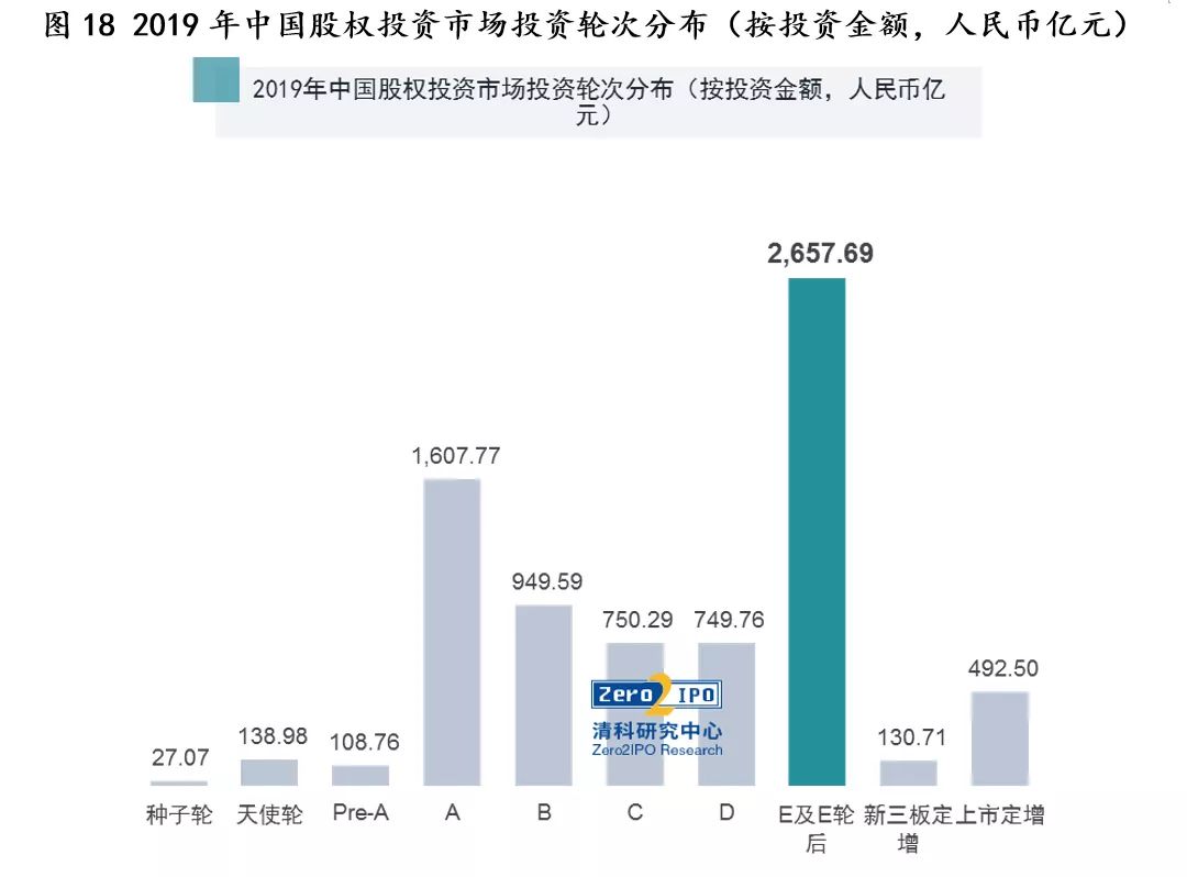 经清科研究中心统计,2019年股权投资市场仍然是A轮投资为主,占比为35.3%。但是E轮及E轮以后(包含股权转让项目)投资案例占比上升6.2个百分点,到达7.6%,投资总金额也高达2,657.69亿元。主要原因是在外部风险增大的背景下,VC/PE机构投资轮次后移,以国企改制类为代表的投资和并购案例增加,如南方航空和格力电器分别于2019年7月和12月完成改制,VC/PE总投资金额分别为417亿和300亿元。