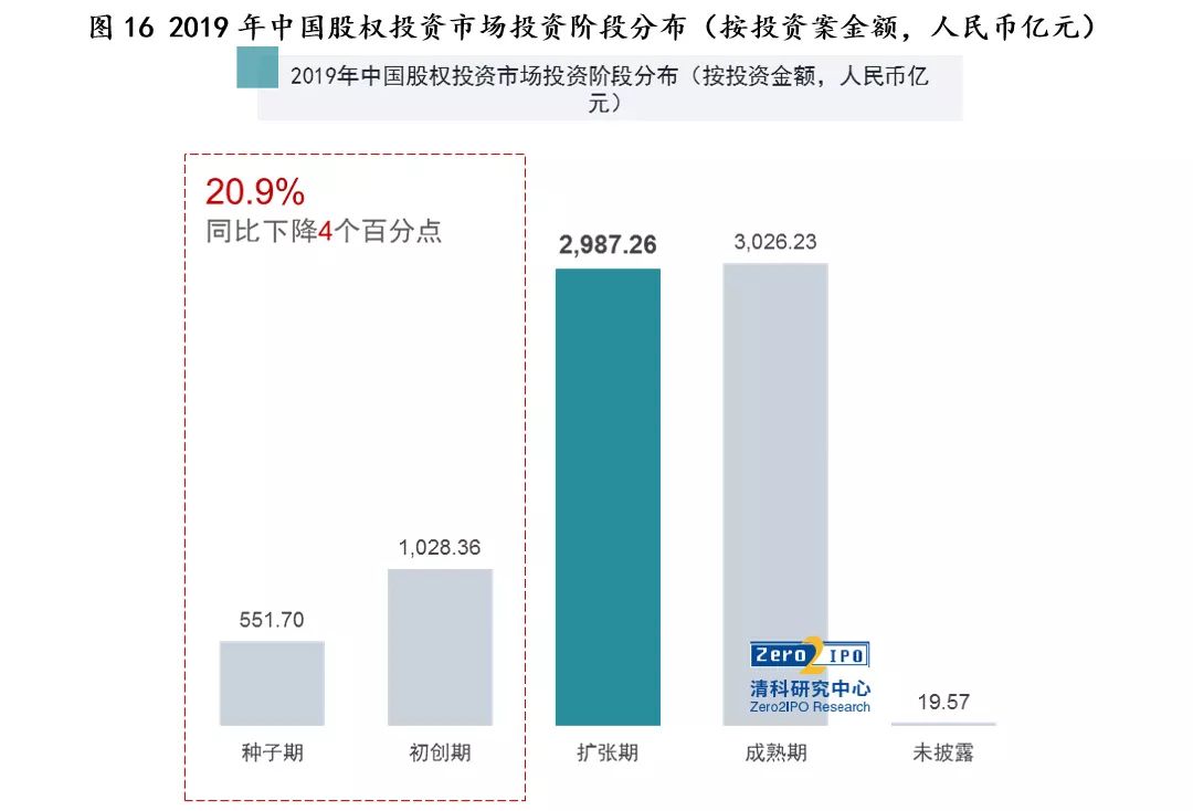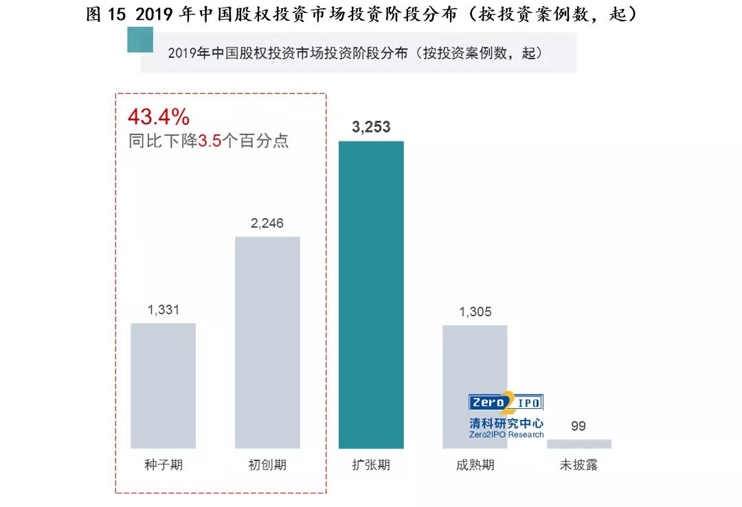 2019年我国股权投资市场种子期和初创期投资案例数为3,577起,占比为43.4%,同比下降3.5个百分点;投资金额为1,580.06,占比下降4个百分点。在经济增速下滑和不确定风险加大的背景下,创投机构避险情绪提升,对成熟企业的投资比重不断加大。