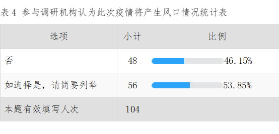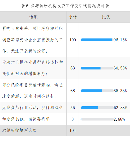 金汇奖:2020后疫情股权投资行业的市场信心调研报告 一、调研简介 金汇奖此次调研从问卷制作到问卷发放再到问卷处理,耗时近一周,期间获得母基金研究中心、36氪、人民创投、安徽省私募协会以及与金汇奖形成合作的投资机构及个人投资者的支持。通过一对一定向发送,截至2020年2月7日,回收有效问卷104份。其中北京48份、上海18份、深圳12份、合肥5份、福州4份、石家庄2份、香港2份、苏州2份、西安2份、成都2份、郑州、长春、广州、宁波、盐城、南京、青岛各1份,参与调研机构所属类别如下表1: 注:调研问卷中此题为多选题,所以该题比例加和不是100%(下同) 透过调研数据,从机构可用资金规模来看,所调研的机构目前可用于投资的储备资金都较充足,具备后疫情投资的基础。如下图1,近85%以上的机构可用投资资金在5,000万以上;可用资金在5亿以上的投资机构数量占比为50.96%。 二、调研结果及分析 通过调研,总体上来看,在新冠肺炎疫情影响下,大部分投资机构依旧看好中国股权投资市场的持续健康发展。机构认为困难只是暂时、阶段性的,主要因为股权投资行业持续周期长,因此受影响相对较小。另外,部分投资机构利用自身专业知识和过往累积资源,能够快速根据市场变化调整投资策略,转危为机,寻求到更好发展机遇。具体调研内容如下: 从此次疫情对机构业务造成的影响来看,仅有9.62%的机构表示并未制定有效应对措施,疫情对业务影响很大;超50%的机构认为疫情对业务开展造成的影响不大,主要因为部分业务可采用线上办公的方式来有效减少影响。。具体数据如下图2: 为什么有这么多的机构并未受到疫情的影响,我们通过多方调研以及36氪2020.01-02月数据,从投资数量和投资金额数据来看,资金依旧集中于科技、金融、消费、文化、娱乐、医疗健康以及高端制造等行业,与受疫情影响严重的餐饮、院线消费等线下行业有较大差异。从重点关注企业服务、医疗健康、人工智能、技术驱动行业的腾讯、红杉资本和经纬创投等投资机构来看,此次疫情的爆发对于这些深耕垂直细分领域和致力于长期投资的机构的影响是有限的。无论是客观数据还是行业观察,股权投资机构重点布局的行业在这次疫情中受到冲击,但影响相对较小。 此次疫情拐点的来临及结束时间受到社会各主体的重点关注。尽管目前还未有一个明确的预估,但从各家机构的调研来看,超过一半的机构认为疫情所带来的影响将持续一个季度;超过86%的机构认为疫情带来的影响持续在半年以下。具体情况如下图3: 从募资情况来看,虽然被调研的大部分机构可投资金充足,但2020年的募资计划并未暂停。只是受到此次疫情影响,短期内增强了募资难度或需要根据疫情影响情况调整募资计划和策略。根据调研可知,有75.96%的投资机构已有的募资计划受到影响,有65.38%的投资机构觉得募资难度加大。在此情况下,大部分机构还是选择构建多元化募资结构,如政府引导基金、市场化母基金、企业投资者等等都成为重点关注的募资渠道,具体情况如下表2: 由于疫情已对我国实体经济造成阶段性的负面影响,虽然不会改变中国经济长期向好的基本面,但是短期内或将加剧我国股权投资市场募资困难的局面。对LP而言,个人投资者、上市公司及其他非上市企业因受疫情冲击,其短期内资金主要用于维持企业的正常运营,出资节奏势必放缓;而以政府引导基金、政府出资平台为代表的国资LP,受行政管理、财政预算影响较大,投资活跃度较以往也将有所下降。 对投资机构而言,基金募集相关工作的操作难度也将加大。外币募资由于部分国家政府颁布临时入境禁令及外资LP对中国经济未来发展的不确定性,募资难度进一步增加;实地尽调、线下访谈等部分工作内容无法通过线上工作完全替代,因此也会对投资机构短期内的募资活动造成不利影响。 从投资方向来看,TMT、生物技术/医疗健康、人工智能及智能制造还是资本重点关注的热门方向,具体情况如下表3: 从投资策略来看,受此次疫情影响,有近一半机构的投资策略受影响: 更加重视周期因素。一方面投资时间要分散,让团队经历完整的投资周期。投资时间的分散是指不在某一年份集中投资。部分投资机构为规避“黑天鹅”、“灰犀牛”等突发事件,因此会设有明确的投资周期和退出周期,明确的投资策略和执行程序,比如股权母基金通常设置3年的投资期,目的是减少周期带来的不利影响。本次疫情属于突发的重大事件,危中有机,部分资金充足的机构就会在疫情过后,迅速找到新形势下的投资机会并展开布局。 考察团队方面更加关注是否经历过完整周期。一般情况下,一支股权投资基金的运作周期为8-10年,如果团队经历过完整的周期,能够将过往失败经历转化为成功经验,对风险的防范意识就越强。 更加重视海外资产配置。这次疫情虽然对国内餐饮、零售、旅游、电影、线下培训等行业造成较大影响,但因为产业之间的关联性,最终会慢慢传导到其他行业,进而会对整个中国经济产生影响。如果投资布局均在国内,那整体均会受到拖累,特别是本次疫情较为严重的湖北武汉地区的被投企业。但如果有部分资产在境外布局,这部分资产受影响的程度将较为有限。 危机的一面是危险,另一面则是机会。每次危机都会孕育新的公司。如2003年非典期间,部分网购、教育、旅