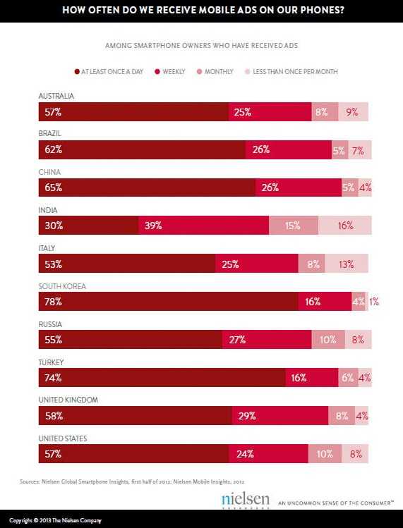 移动设备正以飞快的速度向全球各地覆盖,看样子它不会放过每一个角落。由于这种快速覆盖,使得通过各移动设备传播信息正成为一种举足轻重的传媒手段。目前,移动设备几乎已经成了人们日常生活中寸步不离的必需品,正是因为它的不可代替性,所以移动设备在商家和广告主心中的地位越来越高了,他们希望通过移动设备广泛推广他们的品牌和产品。最近我们对全球范围内的移动用户进行了一次调查,这是对全球移动广告增长的一次概览,借此我们能知道不同市场中移动广告的影响力如何,而世界各地的用户对移动广告的接受程度又是怎样的。