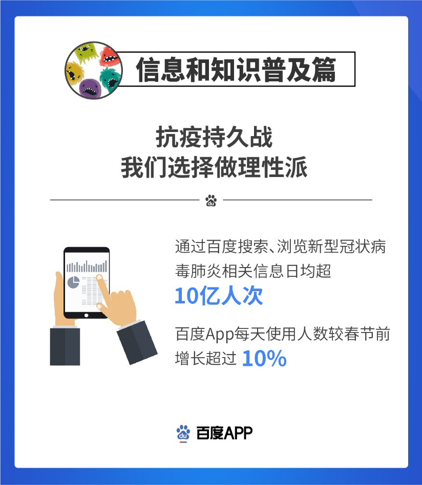 除了主动获取疫情信息,广大网民进一步学习防疫知识的意愿也极其强烈。有超过1亿人次观看百度健康推出的“战疫直播间”,百度健康医典推出的“新型冠状病毒感染的肺炎”词条累计满足用户搜索需求超过2亿。