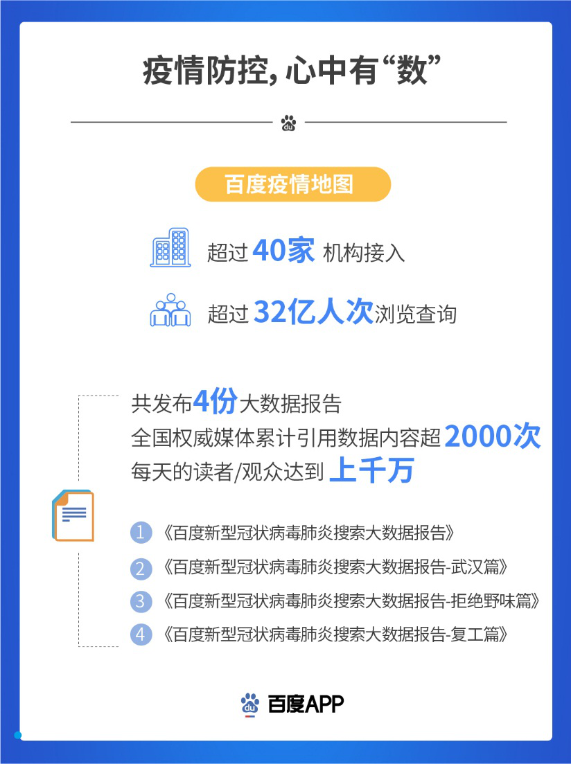 特殊时刻,大数据也成了网民做好自身防护的有力工具。在疫情地图版块,已有超过32亿人次浏览查询疫情动态。百度发布的4份新冠病毒搜索大数据报告也已被全国权威媒体累计引用超2千次,每天的读者、观众达上千万。