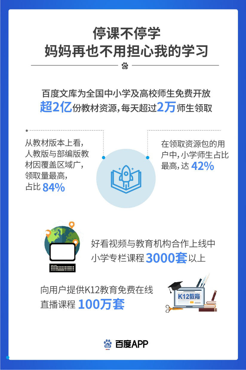 面对停课不停学的需求,百度文库为全国中小学及高校师生免费开放了超2亿份教材资源,每天超过2万师生领取。