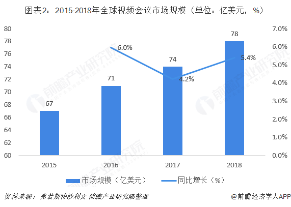 美国Synergy Research估计2019年美国视频会议市场规模将超过60亿美元,来自Frost&Sullivan的数据则显示,2018年,全球视频会议行业市场规模约为78亿美元,增长了5.4%。这个市场过去主要被思科,华为,宝利通等传统大企业占据,类似ZOOM的企业则在快速崛起。国内有机构预估,2020年中国视频会议系统市场规模将超过590亿元。