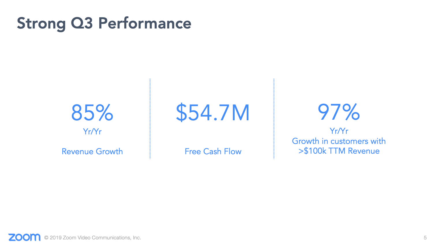 三季度营收增长85%,自由现金流达到5470万美元,过去12个月收入在10万美元以上的客户增长97%。