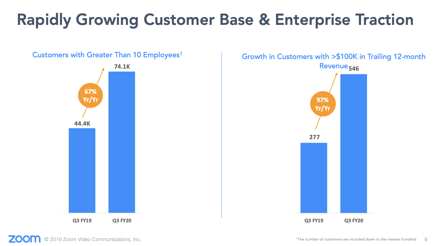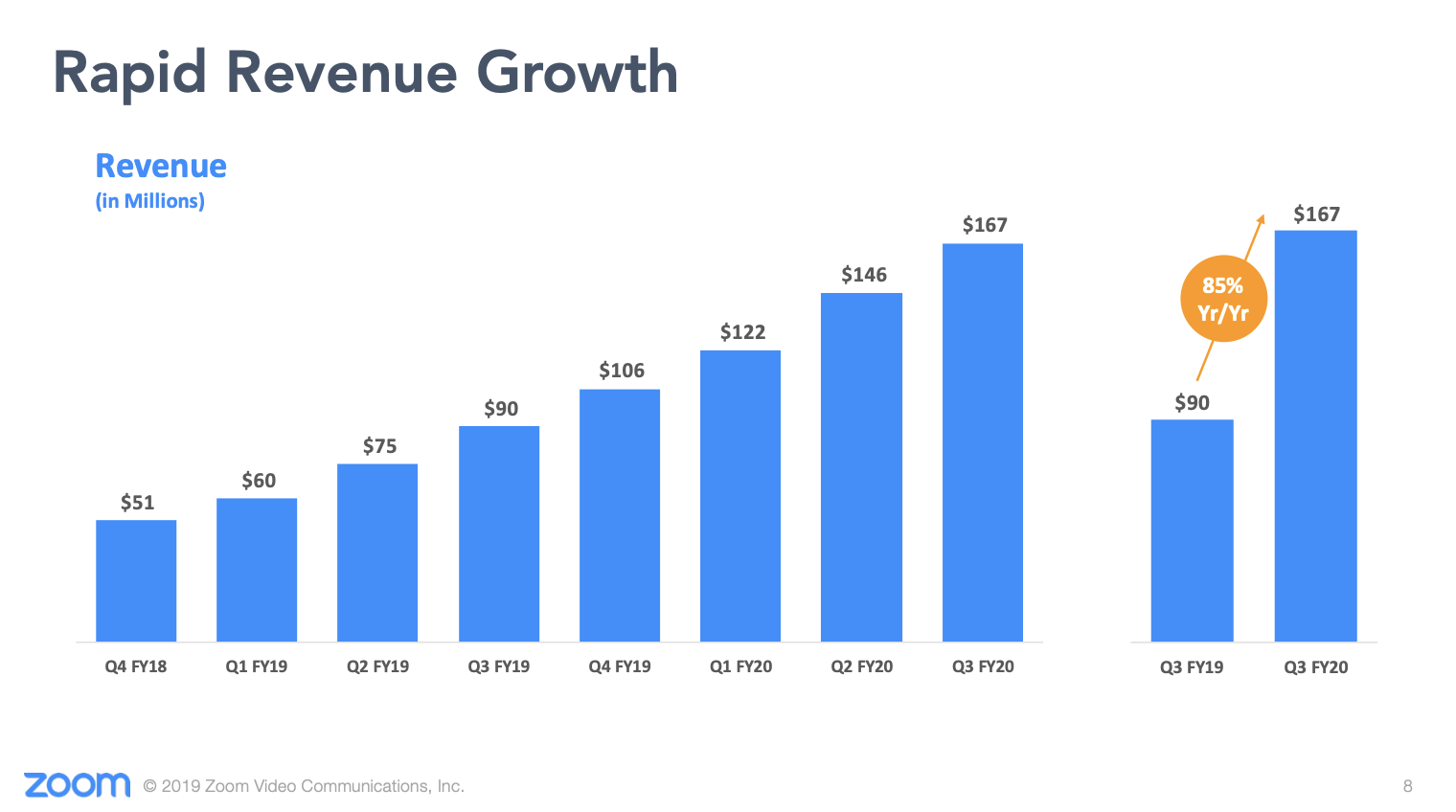 疫情带火了企业办公应用,其中视频会议应用ZOOM毫无疑问成为受益者,股价从60多美金涨至100美金以上,市值达到280多亿美元。在巨头环绕的企业办公场景中,ZOOM到底有何魅力仍能收获投资者的青睐,下面我们废话少说,来看看数据。