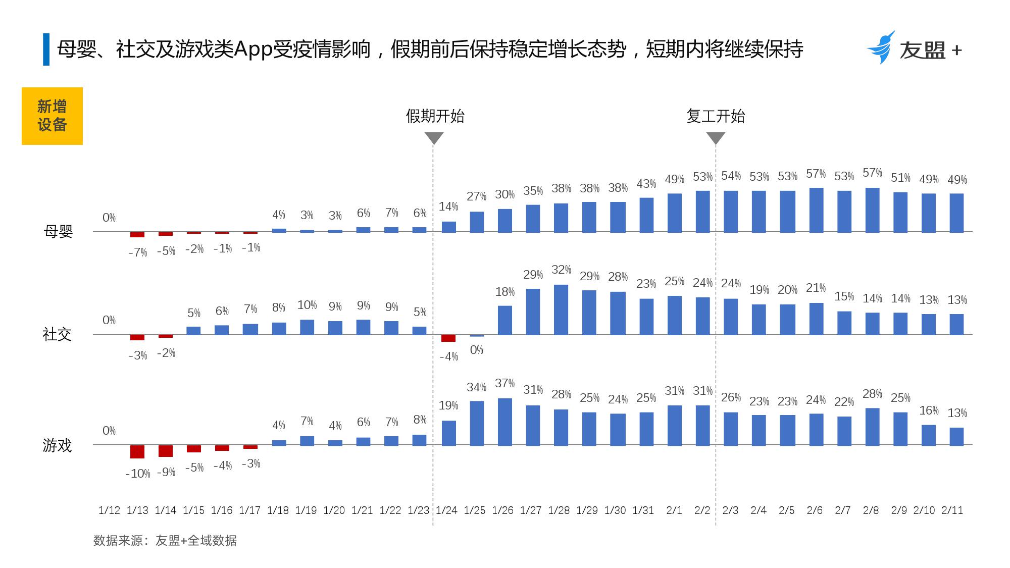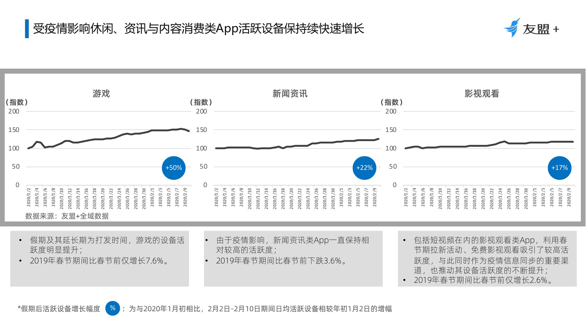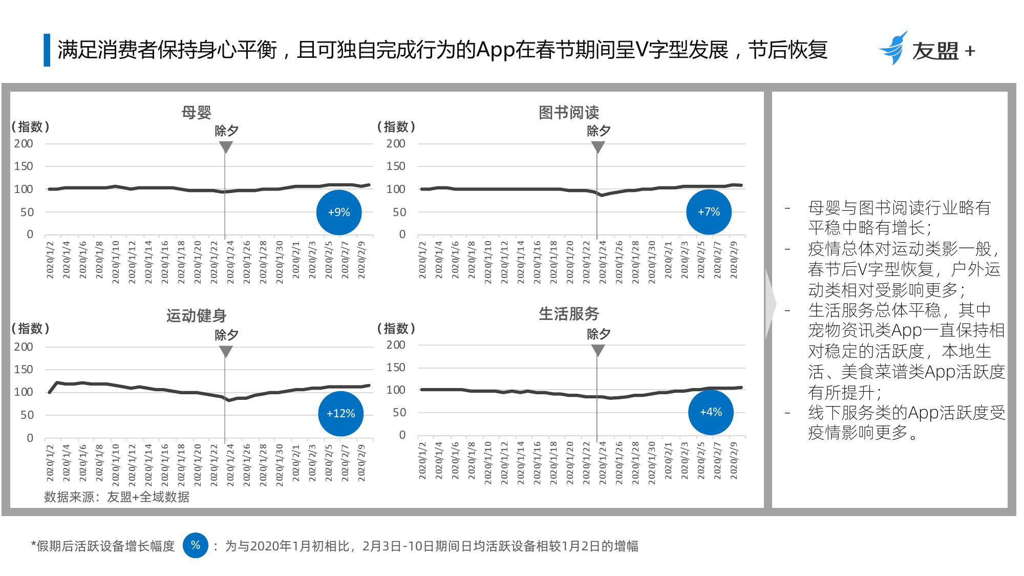 2、受疫情影响休闲、资讯与内容消费类App活跃设备与新增设备量均保持持续增长;母婴、社交、游戏短期内将保持增长;