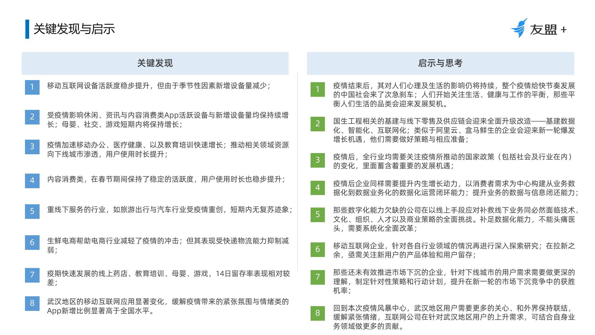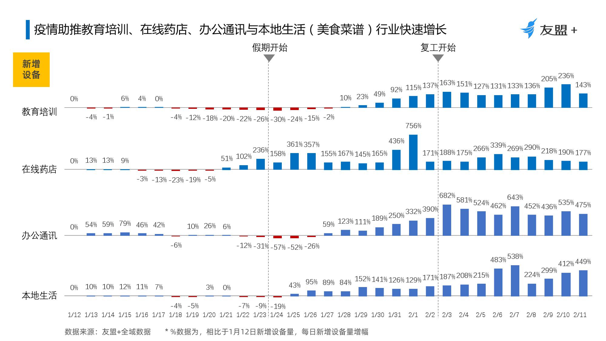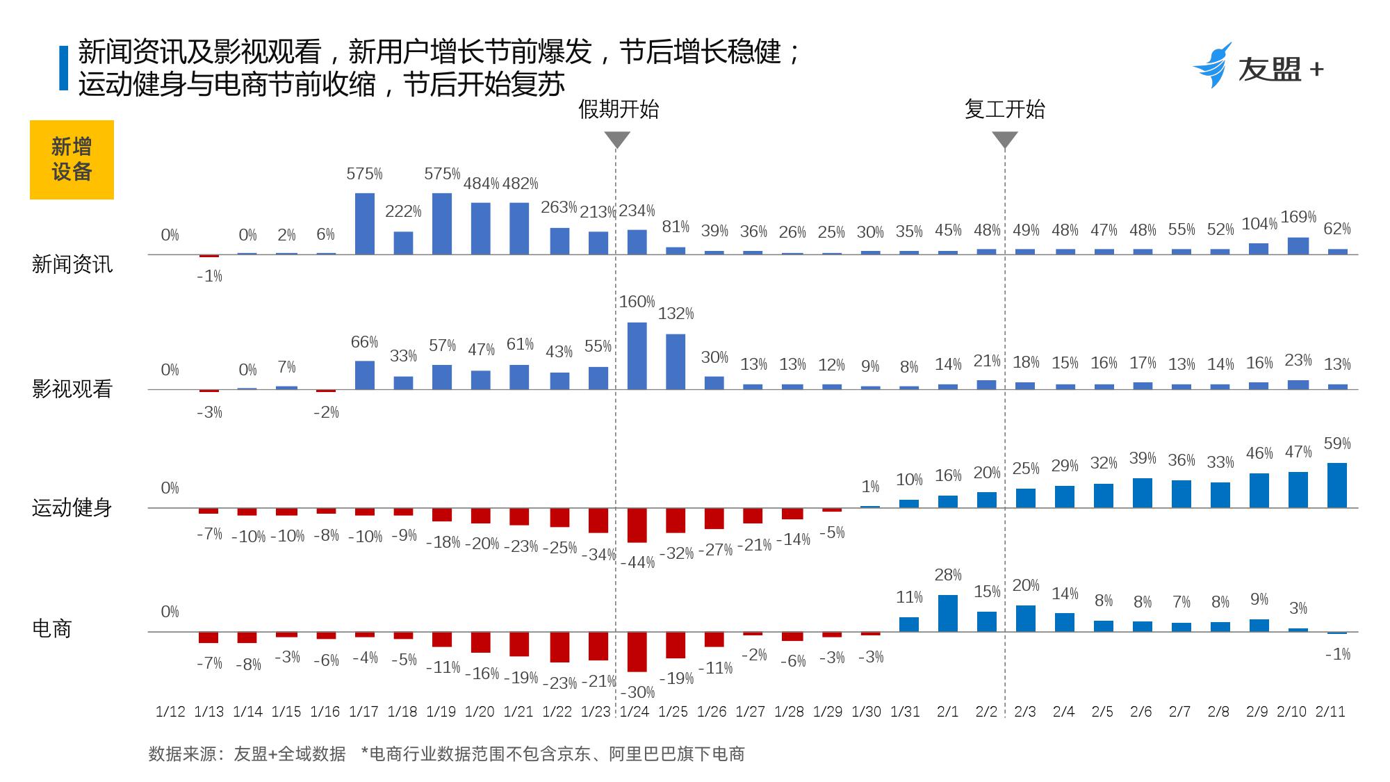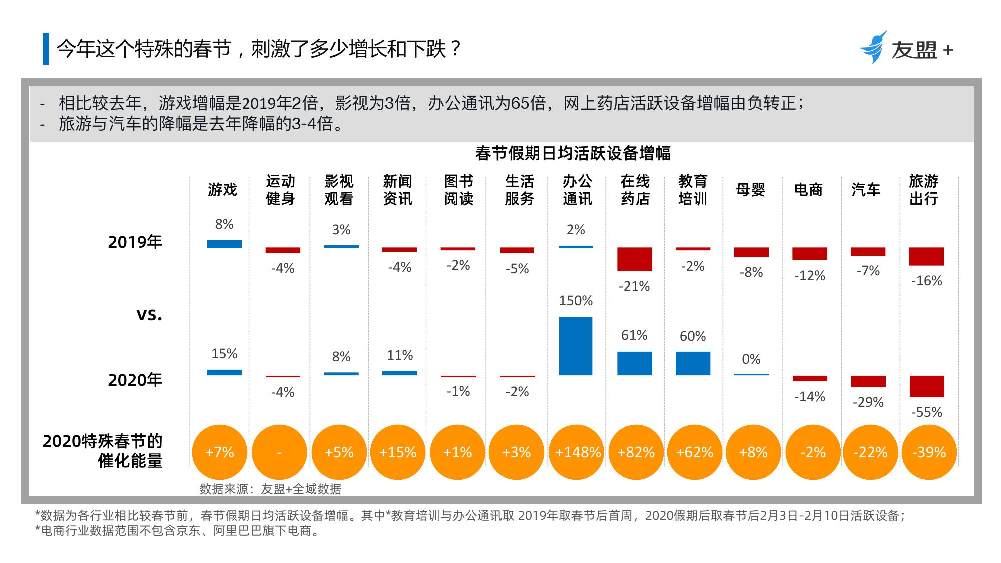 2、受疫情影响休闲、资讯与内容消费类App活跃设备与新增设备量均保持持续增长;母婴、社交、游戏短期内将保持增长;