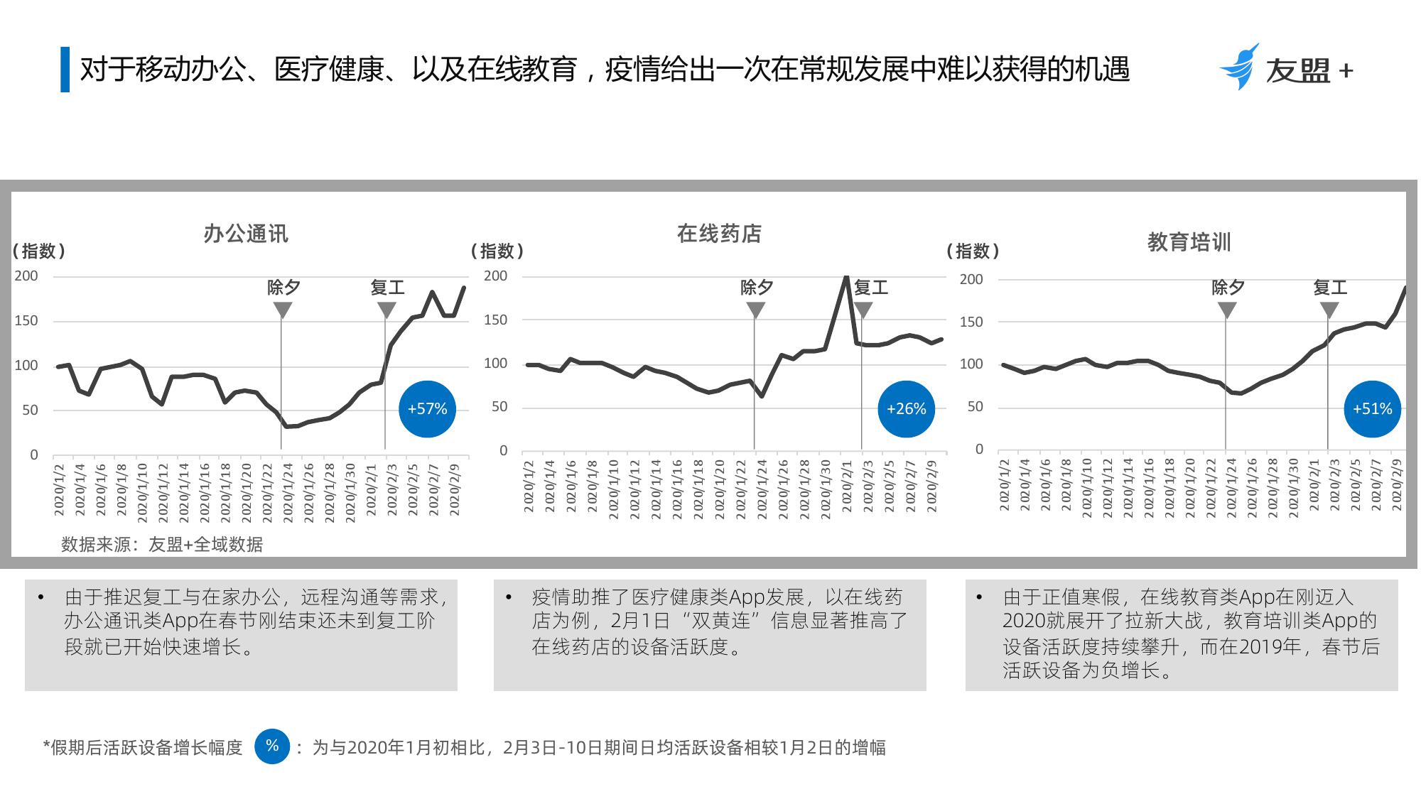 3、疫情加速移动办公、医疗健康、以及教育培训快速增长;推动相关领域资源向下线城市渗透,用户使用时长提升;