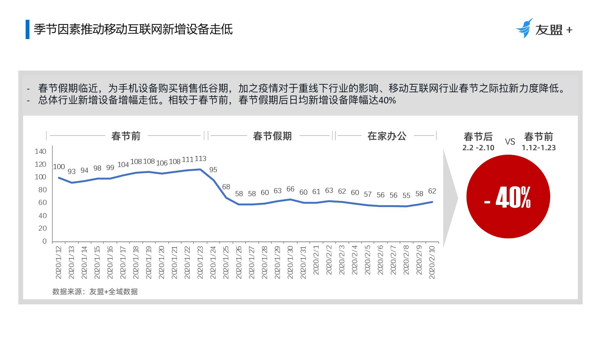 1、移动互联网设备活跃度稳步提升,但由于季节性因素新增设备量减少;
