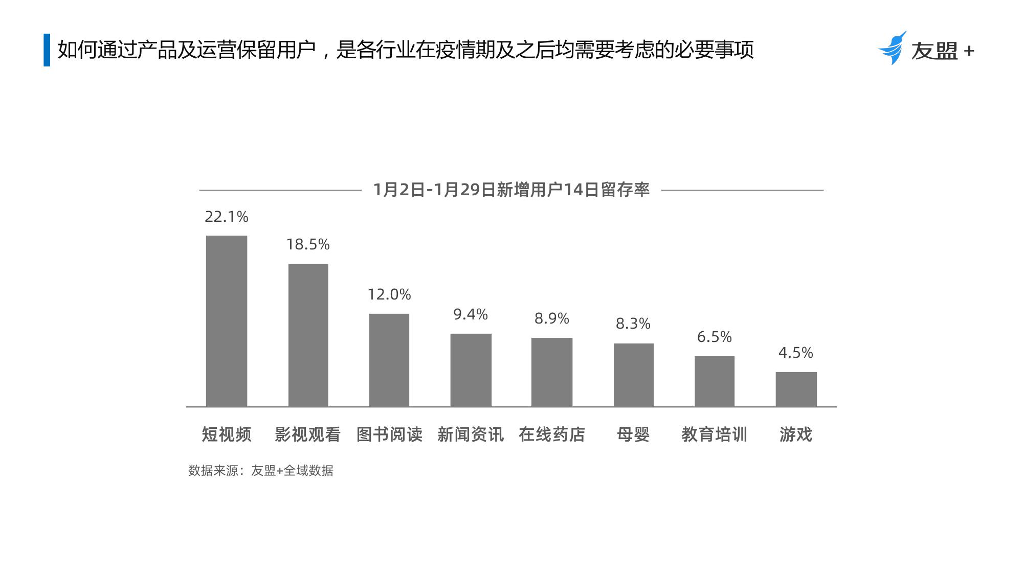 7、疫期快速发展的线上药店、教育培训、母婴、游戏,14日留存率表现相对较差;