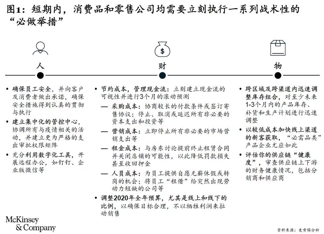 面对突如其来的疫情,所有的消费品和零售企业都无法独善其身,清晰的判断与积极的谋划必不可少。麦肯锡基于多年深耕消费品与零售行业的经验,以及对当前数据的分析与把握,建议企业关注短期与中长期两个方面。从短期而言,企业要采取一系列紧急战术性举措,克服阵痛;从中长期而言,企业应着眼危机后的增长和复苏战略,放眼未来,积极布局 “新常态”,建立自身的竞争优势。
