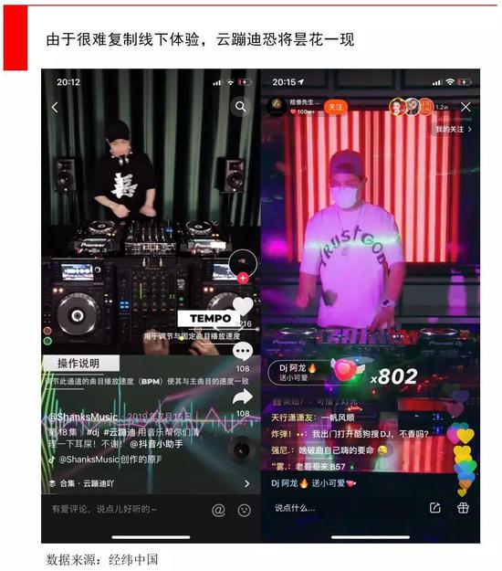 最有意思的新兴场景就是“云蹦迪”了。由于疫情导致夜店被暂时停业,各家夜店和电音厂牌陆续登陆快手等互联网平台,抢占直播高地,DJ们在直播间像网红一样表演,让喜欢夜店的年轻人宅在家里就能“蹦迪”,接受用户打赏。