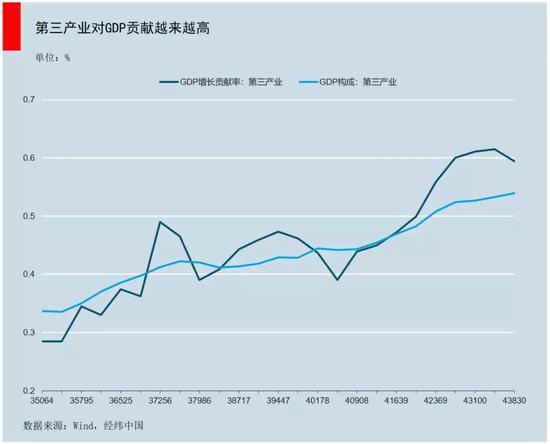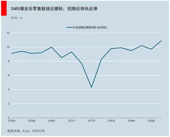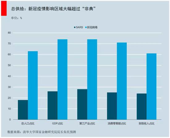 诸多分析拿SARS来锚定本次疫情的经济影响,但这种类比其实不成立。核心在于SARS仅仅在北京、香港等地比较严重,并未影响全国,也没有达到封闭小区或是关闭电影院和商场的地步。所以SARS期间全国社会消费品零售总额仅仅出现了增速上的下滑,疫情一过就立即反弹。另外值得注意的是,2003年第三产业仅占GDP贡献的42%,但2019年这一比例达到54%。