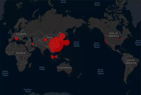 新型冠状病毒全球蔓延图(约翰·霍普金斯大学系统科学与工程中心)