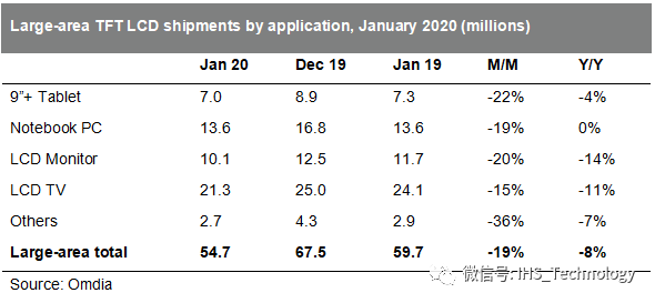 据Omdia《大尺寸面板月度出货追踪报告》显示,1月份大尺寸面板出货达成5,470万片,相较上月下降19%,而较2019年1月同比下降8%。由于今年春节较早,从1月24日起,占据全球高世代产线产能超过50%的中国大陆就开始休假,因此1月出货环比及同比下降应该说都是在预计之中的(2019年春节假期自2月4日起,因此1月出货不受影响)。而自1月中下旬开始的COVID-19新冠疫情,也或多或少对于1月出货下降有一定影响。