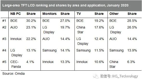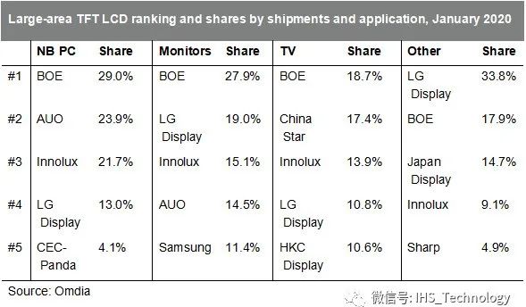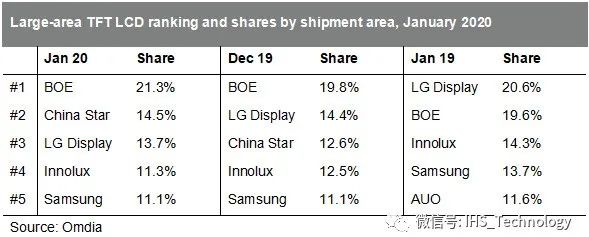 出货排名:京东方和华星光电占据全球大尺寸面板出货面积前二