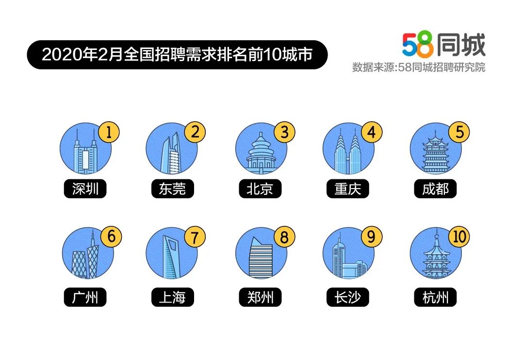据58同城招聘研究院2020年2月招聘大数据显示,全国招聘需求排名前10的城市分别为深圳、东莞、北京、重庆、成都、广州、上海、郑州、长沙、杭州。这10大招聘热门城市均为一线或新一线城市,其中,珠三角、长三角和成渝地区的招聘需求量较大,而受疫情影响,武汉企业大部分仍未复工,因此招聘需求量并未进入全国前10名。