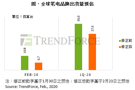 受到疫情影响,笔电供应链面临复工延后、缺工、缺料以及物流运输严格管控等诸多问题,全球市场研究机构集邦咨询将二月份全球笔记本电脑出货量预估由原先的1,080万台,下修至570万台,较去年同期衰退47.6%。