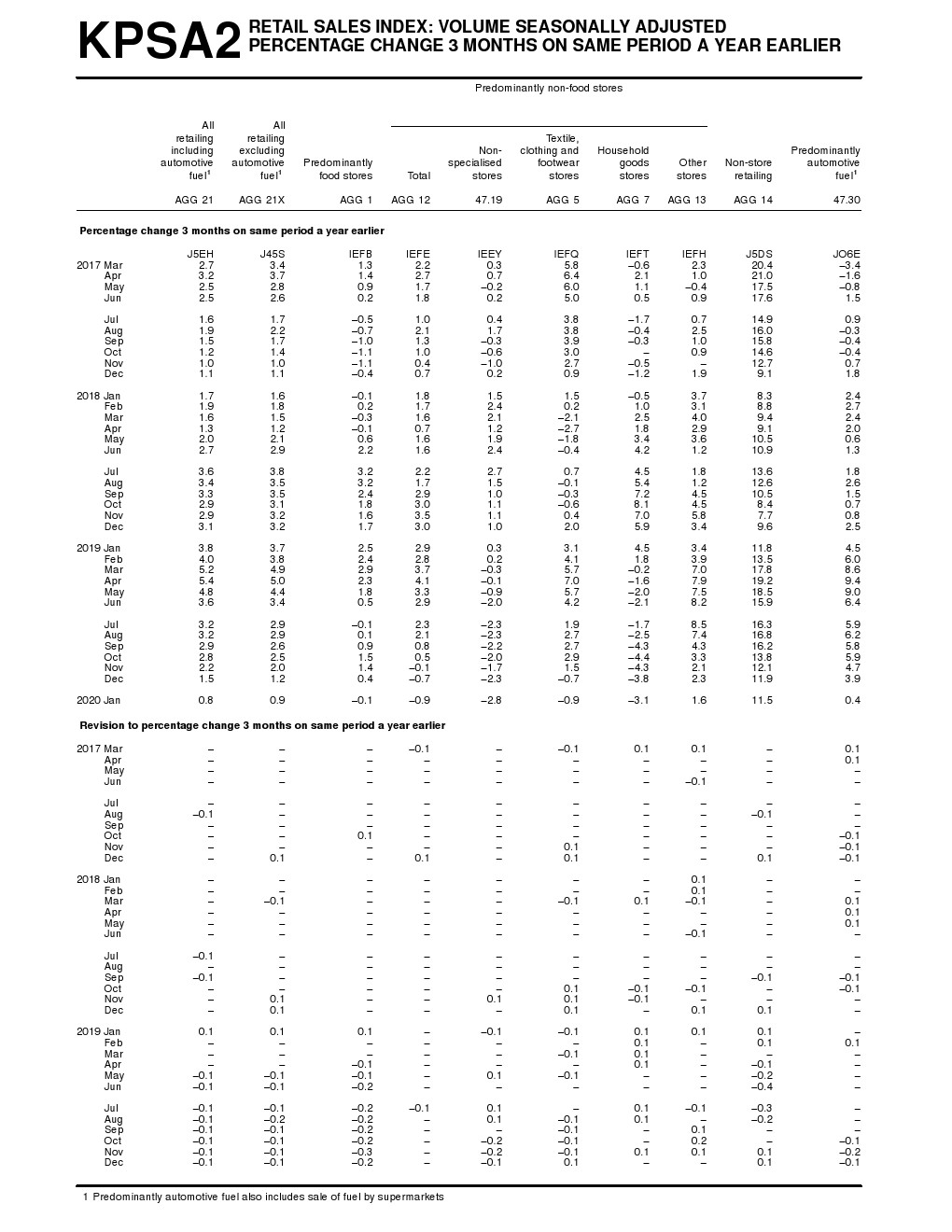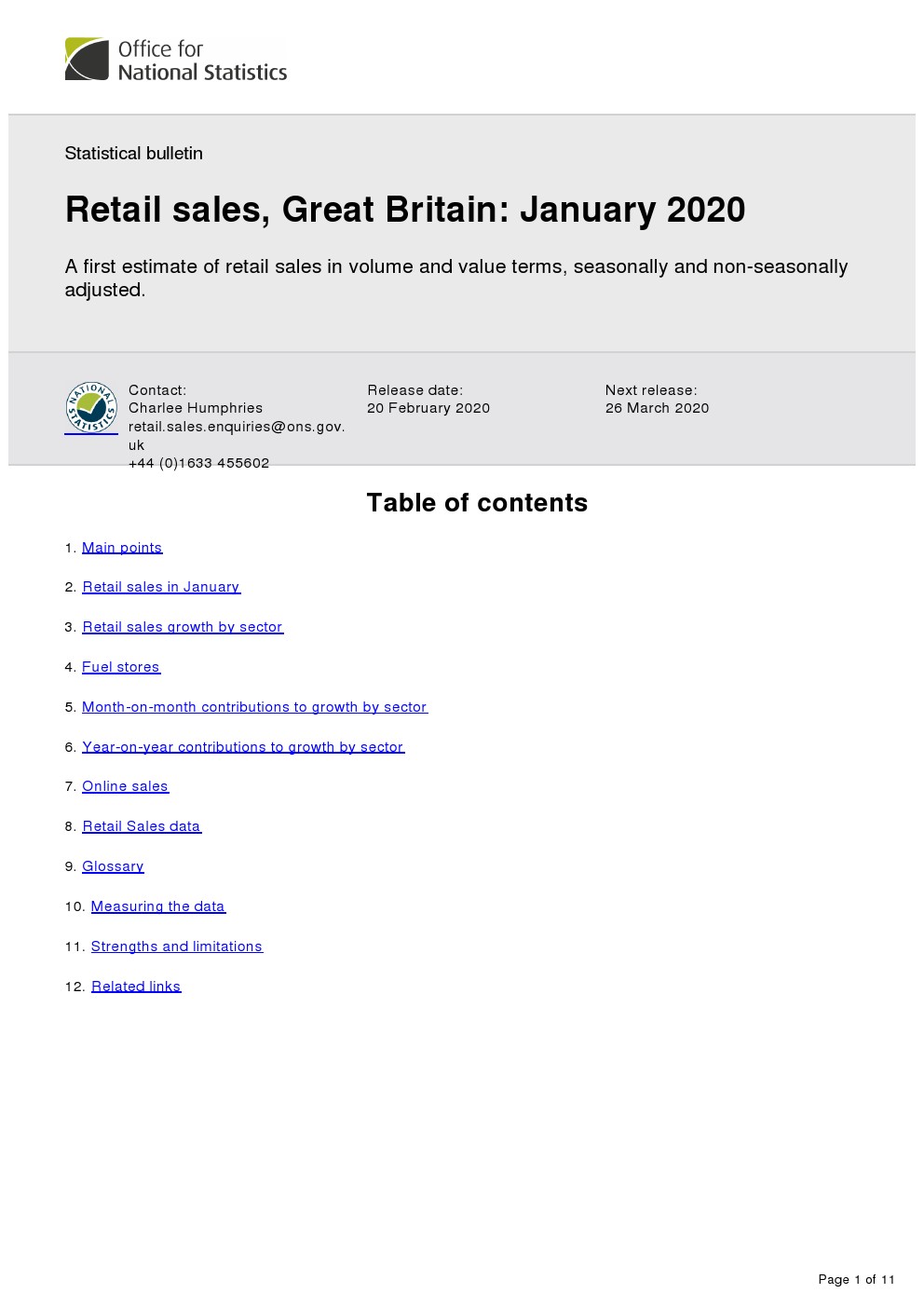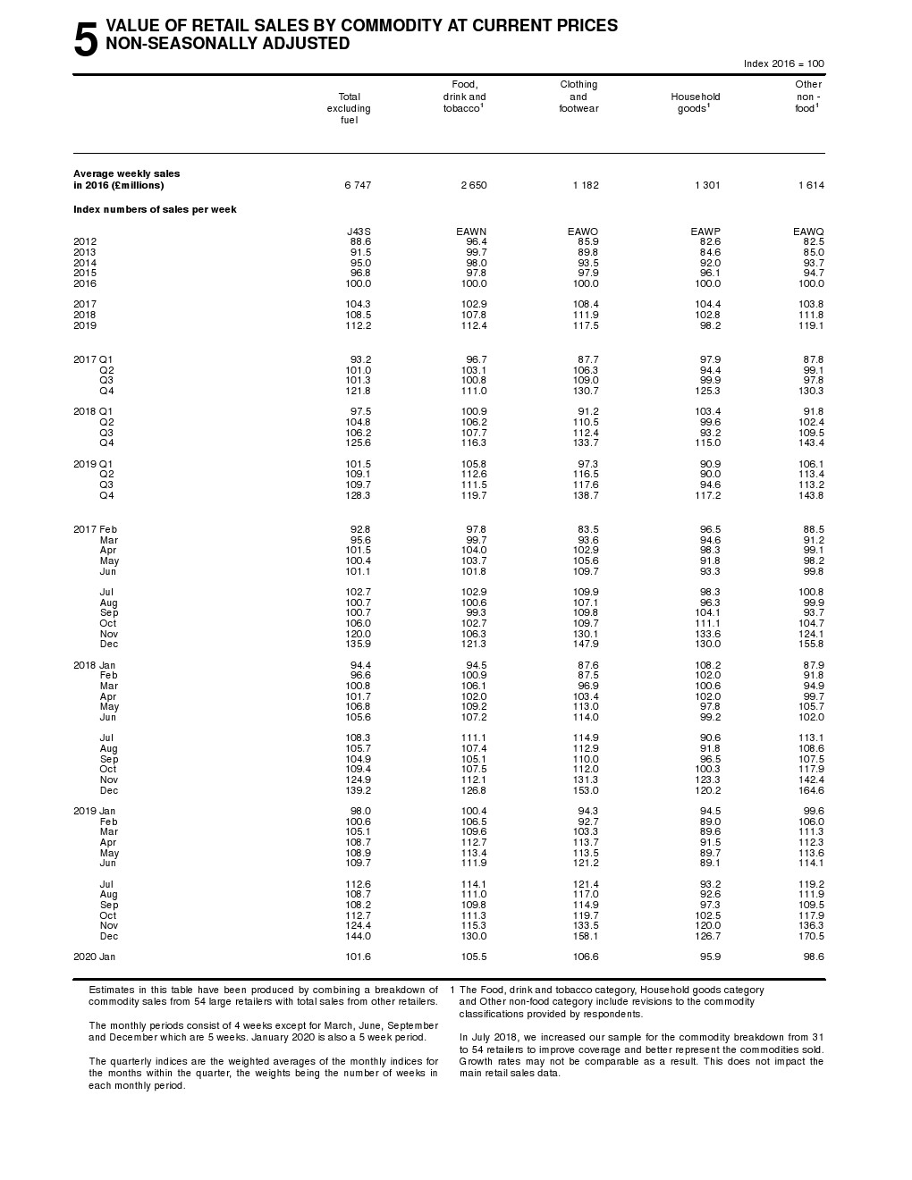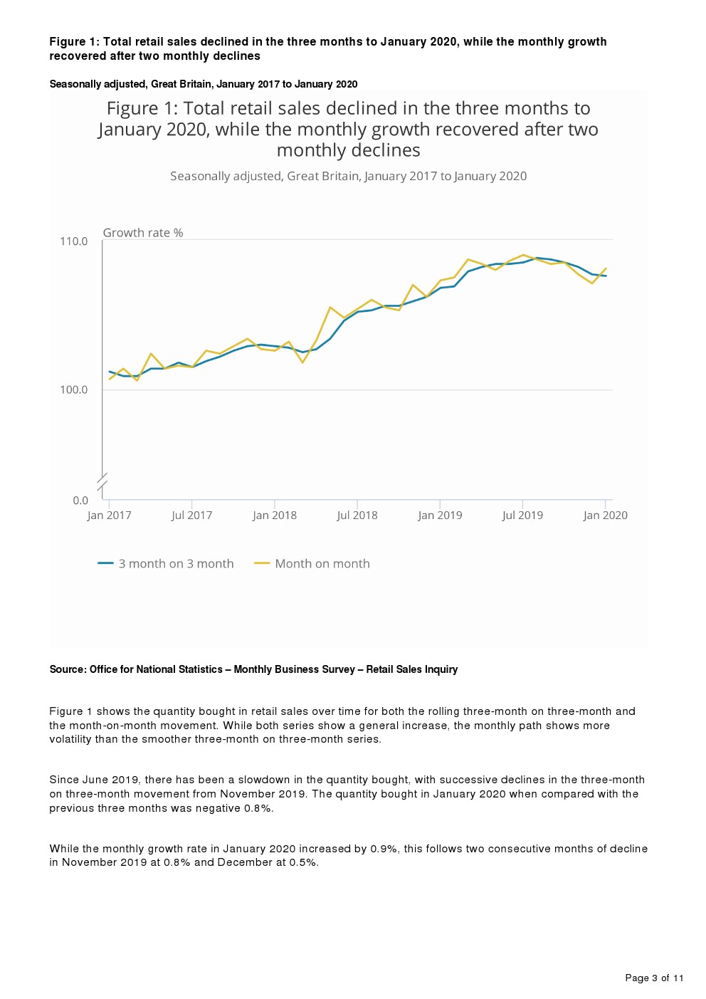 英国国家统计局发布了“2020年首个零售报告”。截至2020年1月的三个月里,零售业销量与前三个月比下降了0.8%,所有行业都出现了下降。2020年1月零售销售额增长0.9%,从前两个月的下降中恢复过来;增长的主要动力是食品店(1.7%)和非食品店(1.3%)。与2019年12月相比,2020年1月燃油销售额下降5.7%,这与12月至1月期间燃油价格上涨有关。2020年1月,在线销售额占所有零售业销售额的19.0%,低于2019年12月的19.3%。