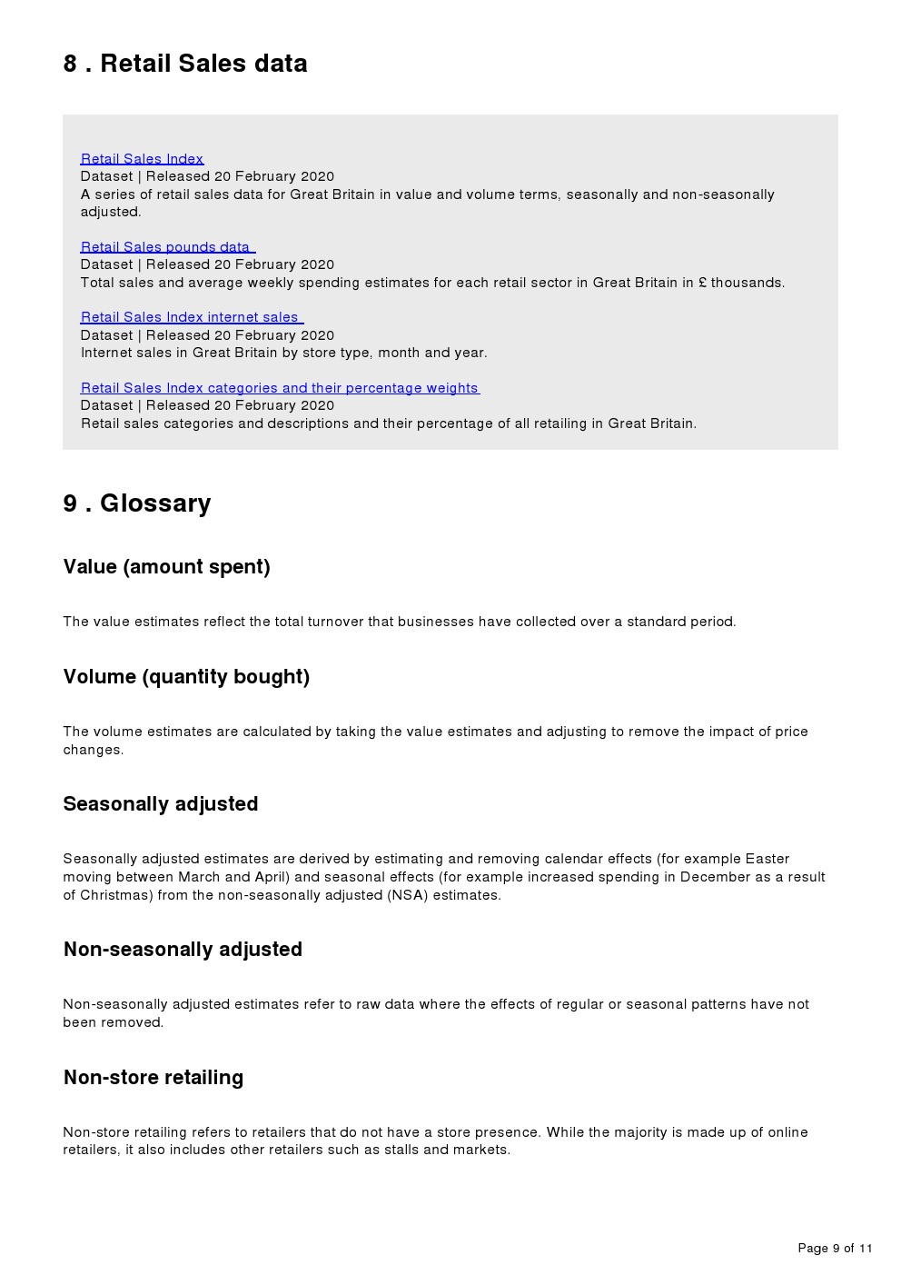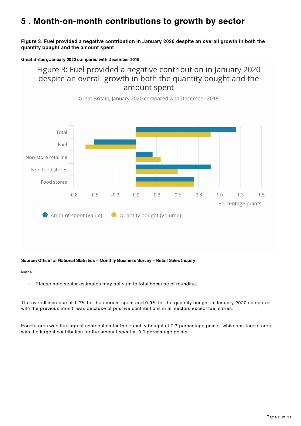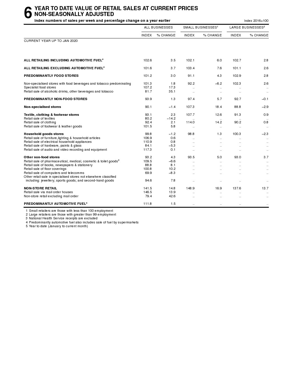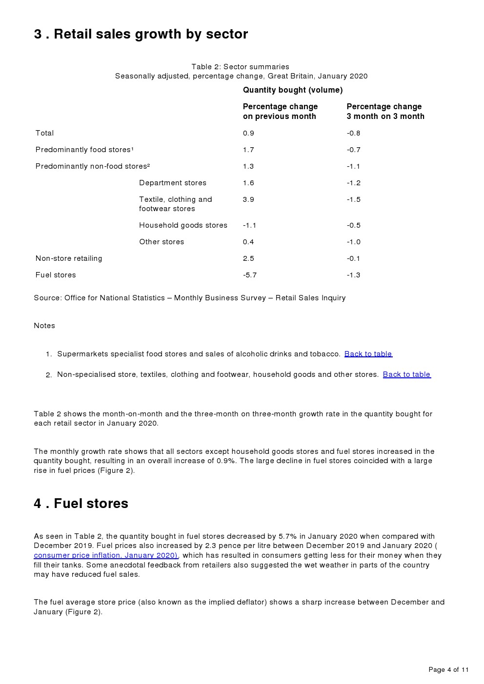 英国国家统计局发布了“2020年首个零售报告”。截至2020年1月的三个月里,零售业销量与前三个月比下降了0.8%,所有行业都出现了下降。2020年1月零售销售额增长0.9%,从前两个月的下降中恢复过来;增长的主要动力是食品店(1.7%)和非食品店(1.3%)。与2019年12月相比,2020年1月燃油销售额下降5.7%,这与12月至1月期间燃油价格上涨有关。2020年1月,在线销售额占所有零售业销售额的19.0%,低于2019年12月的19.3%。