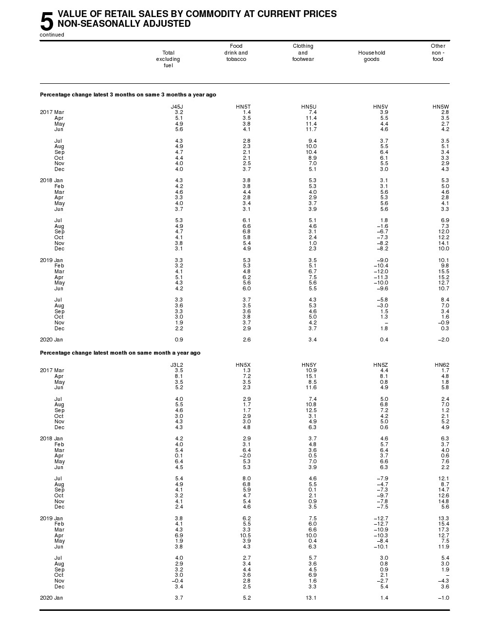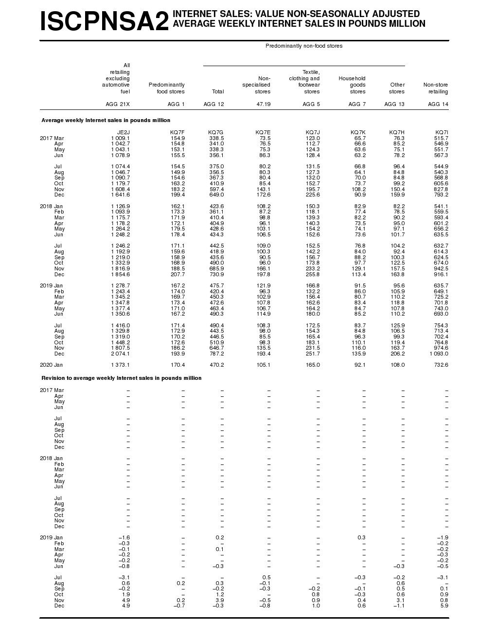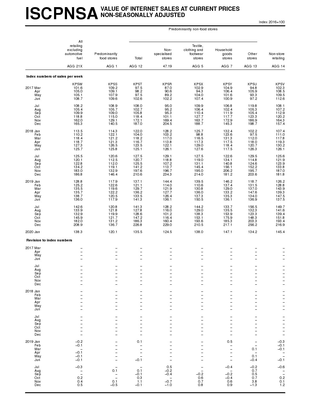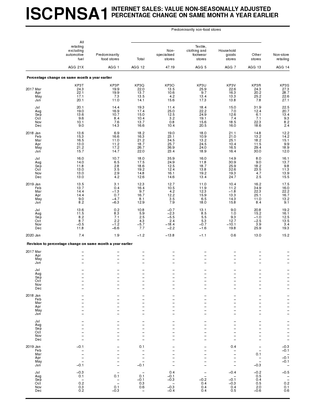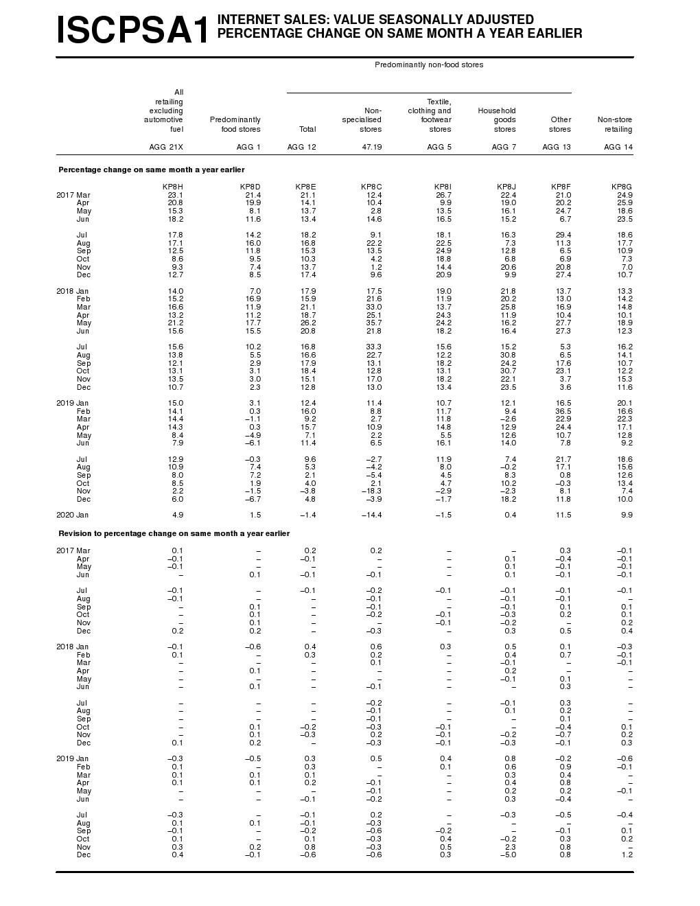 与2019年12月相比,2020年1月在线支出增长0.9%,其中食品店增长5.7%,非商店零售增长5.1%。非食品类商店出现6.8%的跌幅,很大程度上是由于百货公司(-4.8%)和家居用品商店(-26.7%)的大幅下降。这些商店在前一个月经历了强劲的增长,百货商店增长了16.9%,家居用品商店增长了19.6%。