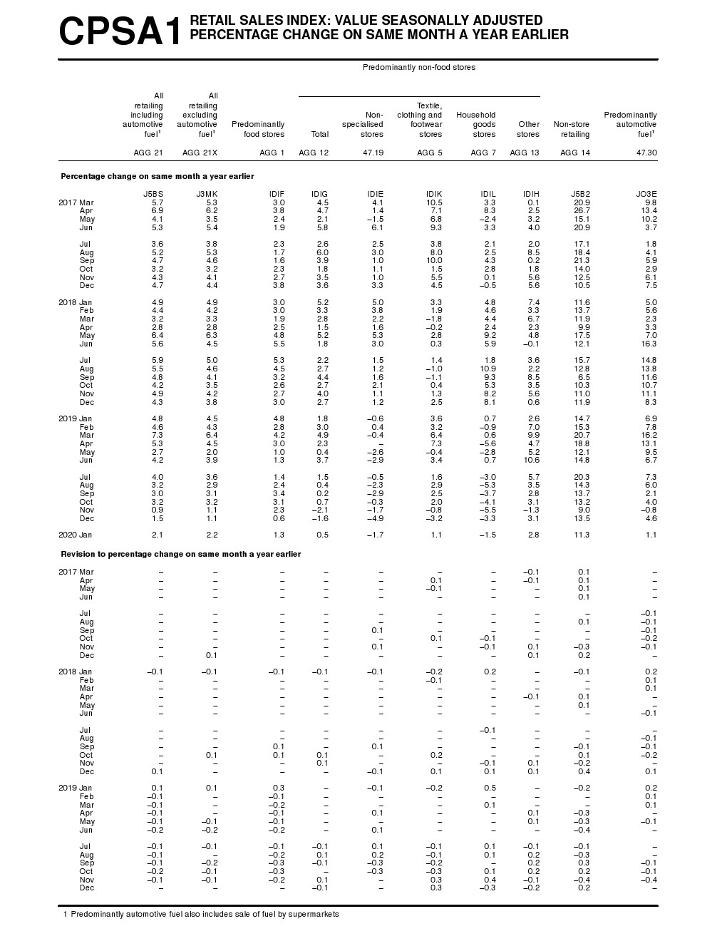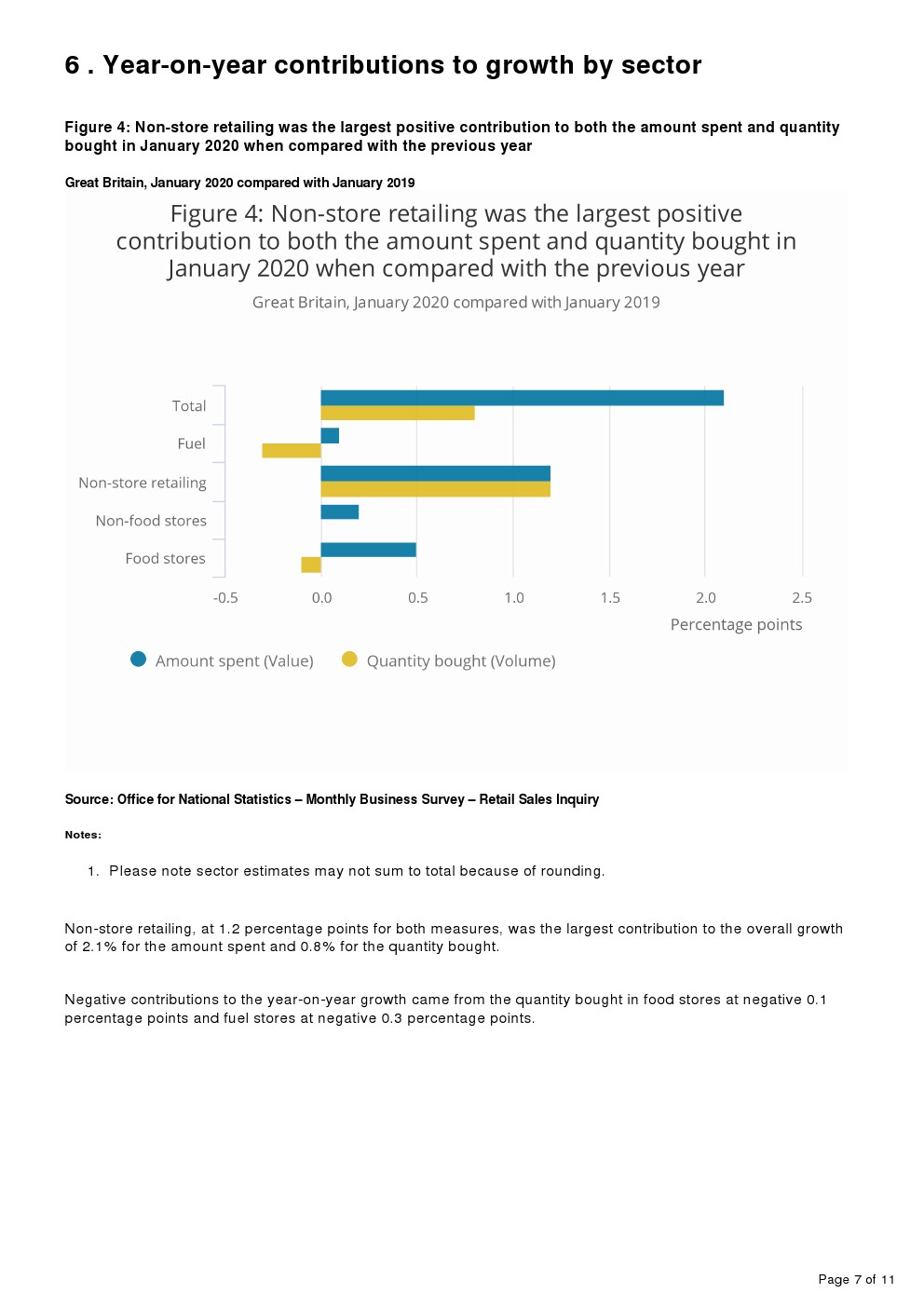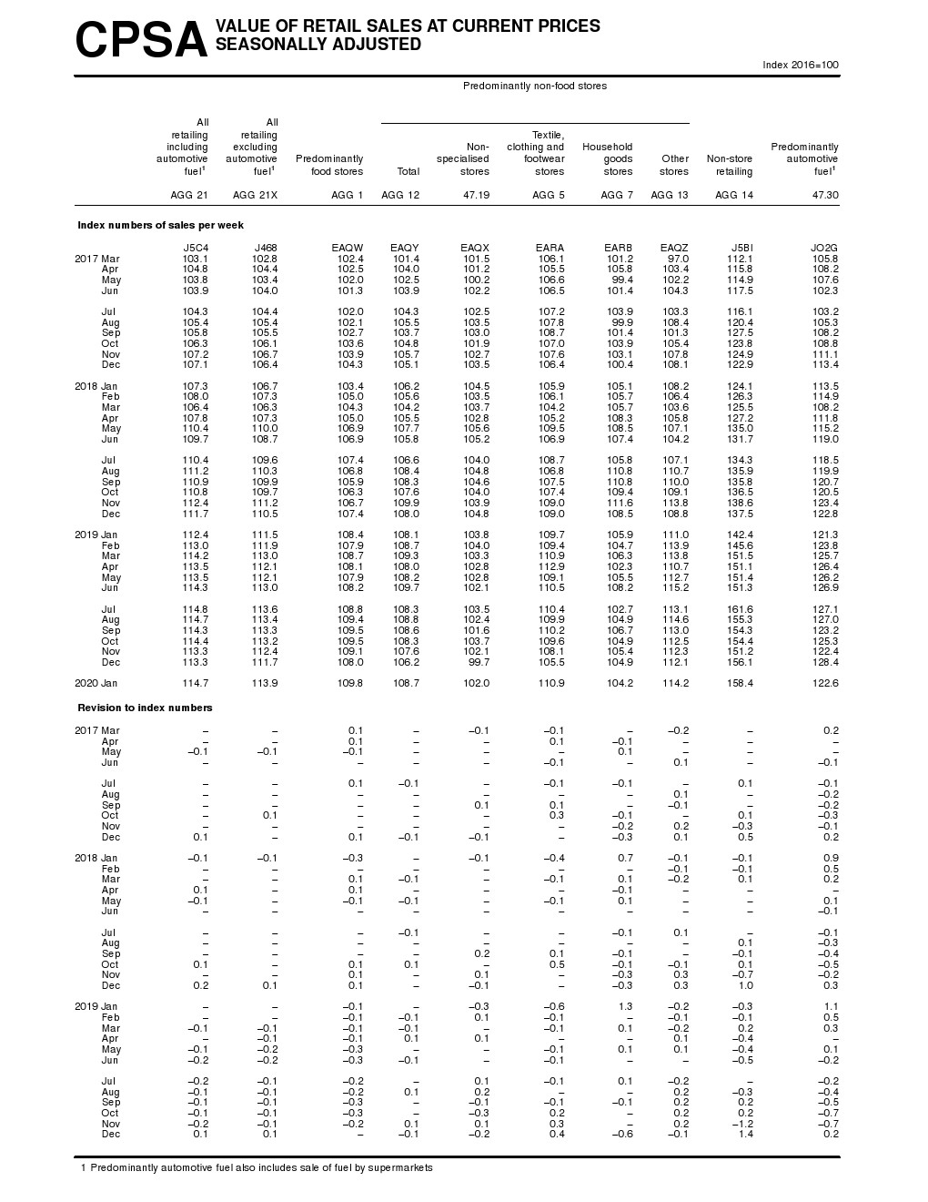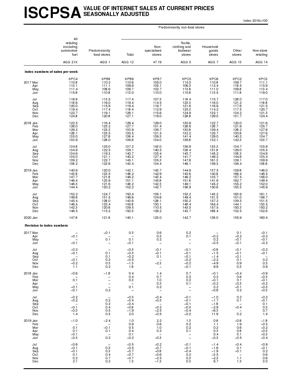 与2019年12月相比,2020年1月在线支出增长0.9%,其中食品店增长5.7%,非商店零售增长5.1%。非食品类商店出现6.8%的跌幅,很大程度上是由于百货公司(-4.8%)和家居用品商店(-26.7%)的大幅下降。这些商店在前一个月经历了强劲的增长,百货商店增长了16.9%,家居用品商店增长了19.6%。