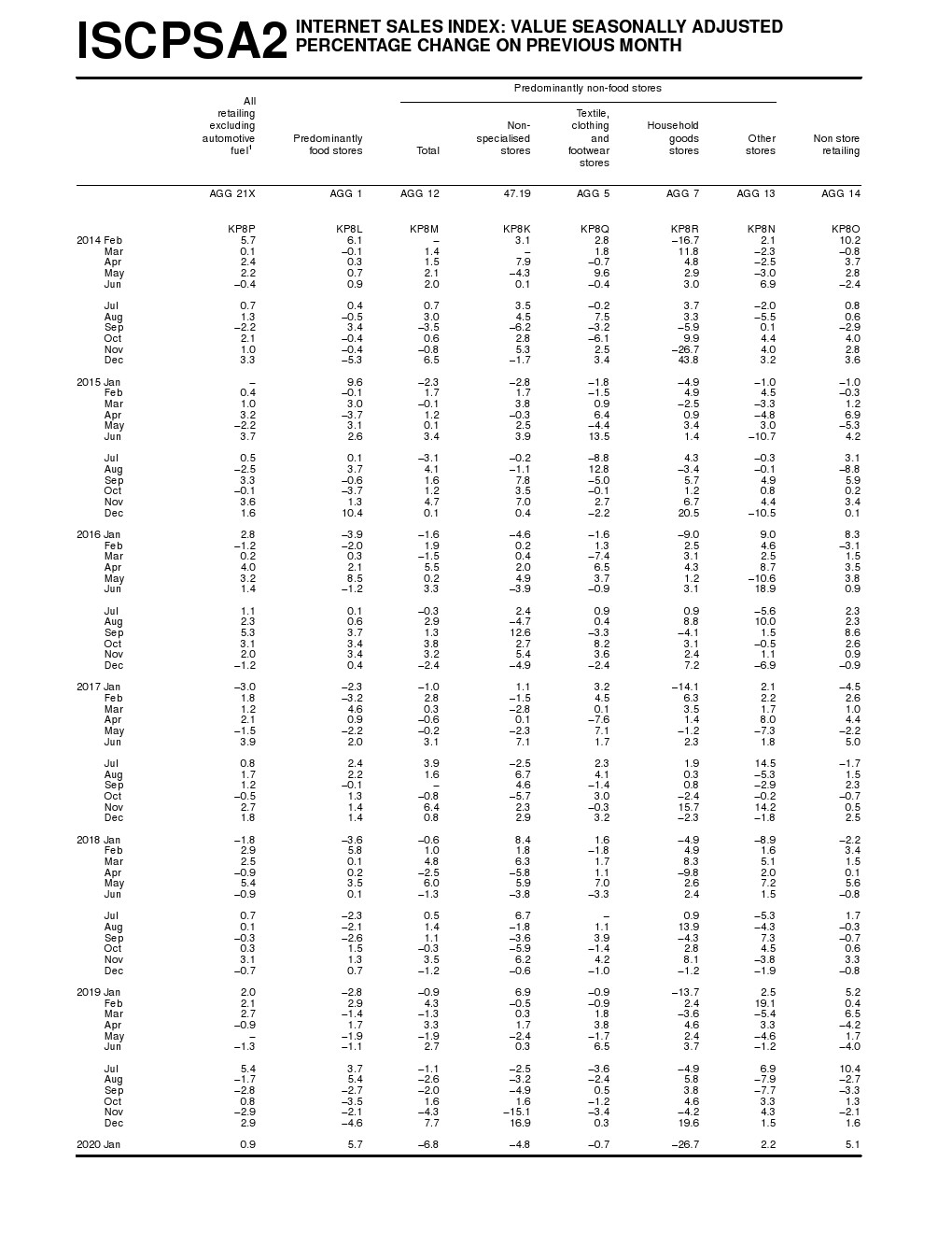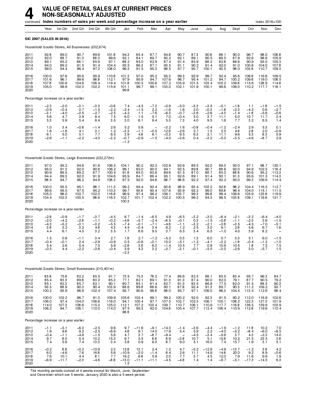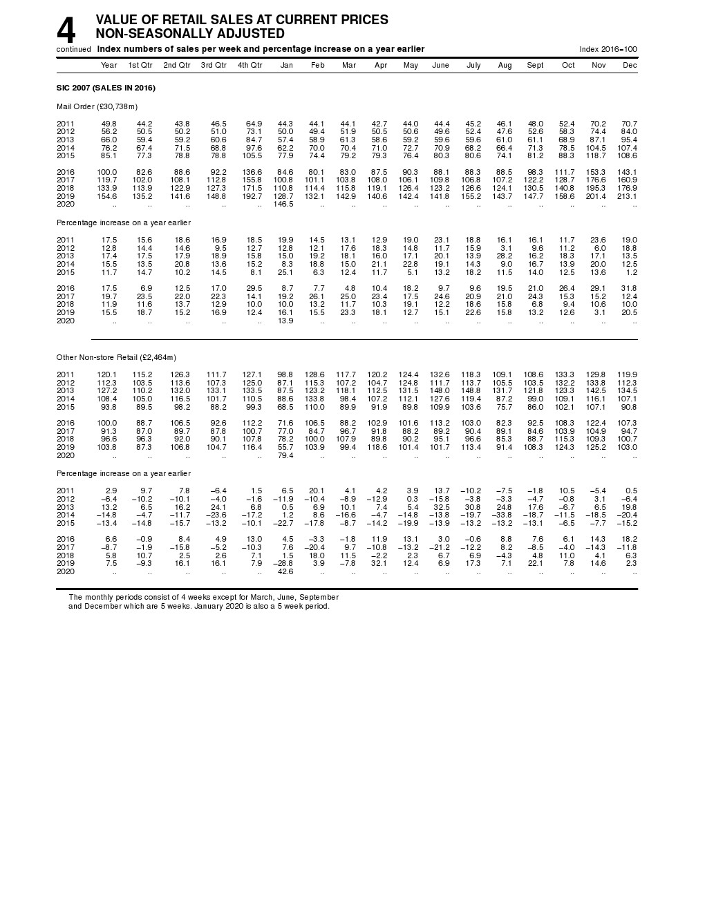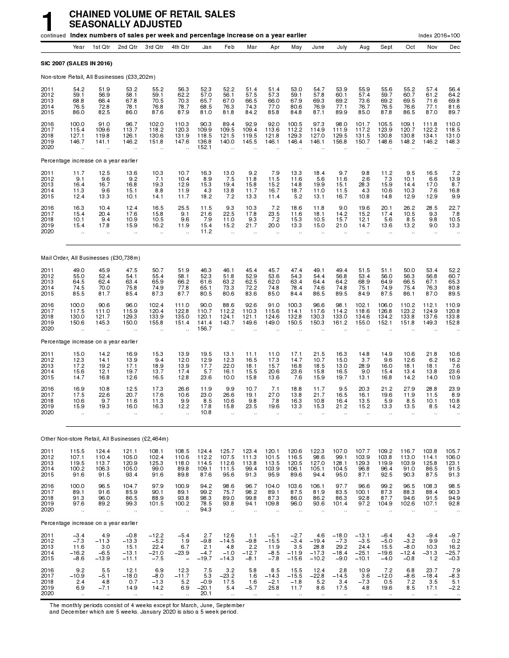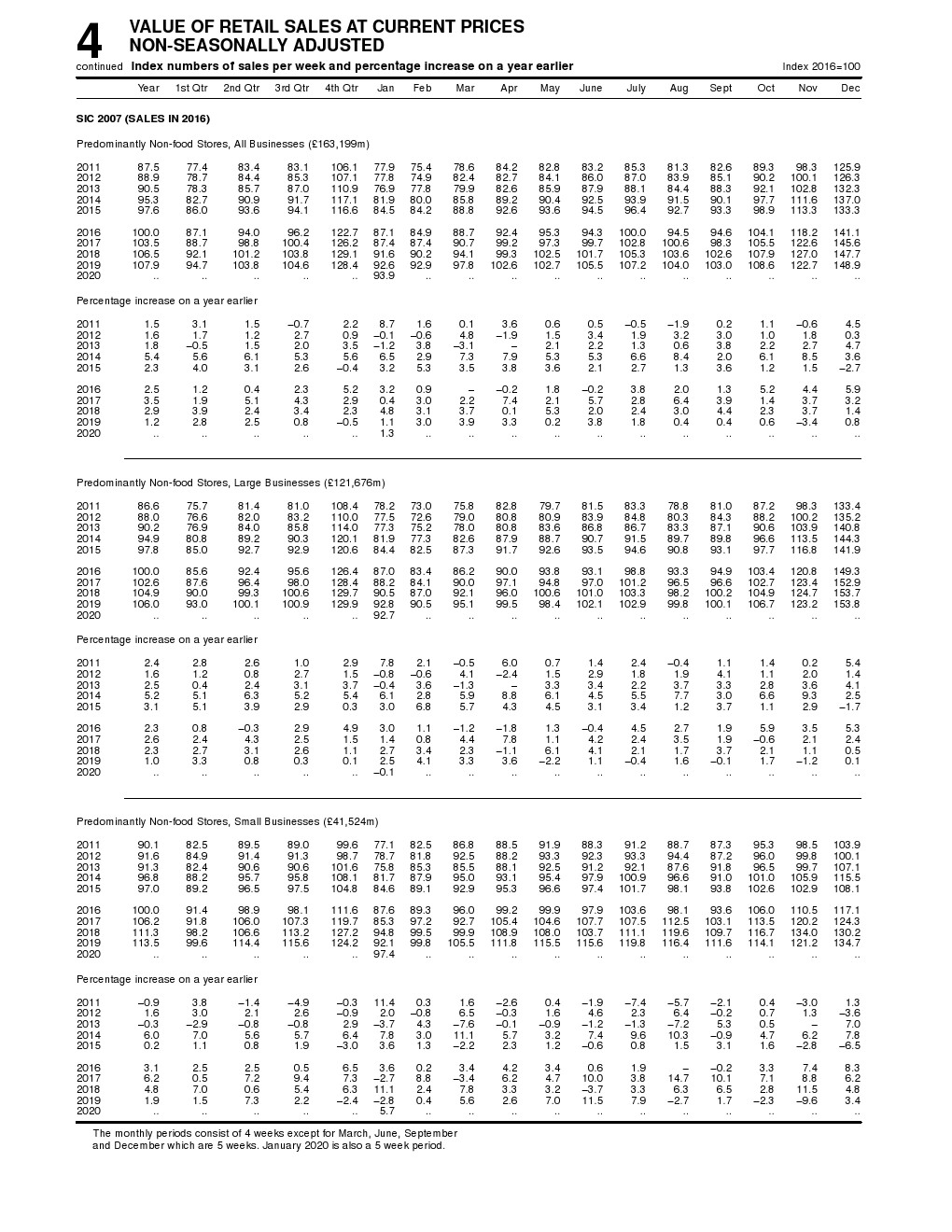 与2019年12月相比,2020年1月在线支出增长0.9%,其中食品店增长5.7%,非商店零售增长5.1%。非食品类商店出现6.8%的跌幅,很大程度上是由于百货公司(-4.8%)和家居用品商店(-26.7%)的大幅下降。这些商店在前一个月经历了强劲的增长,百货商店增长了16.9%,家居用品商店增长了19.6%。