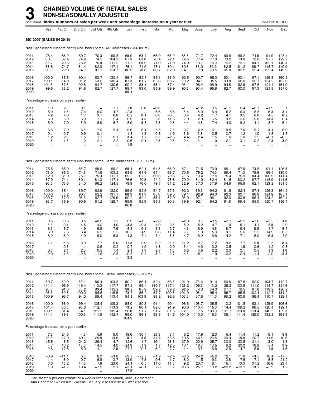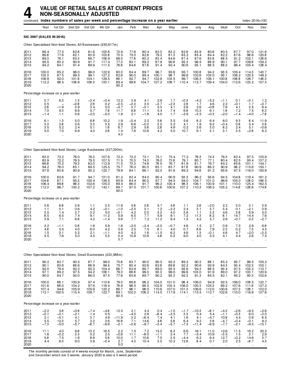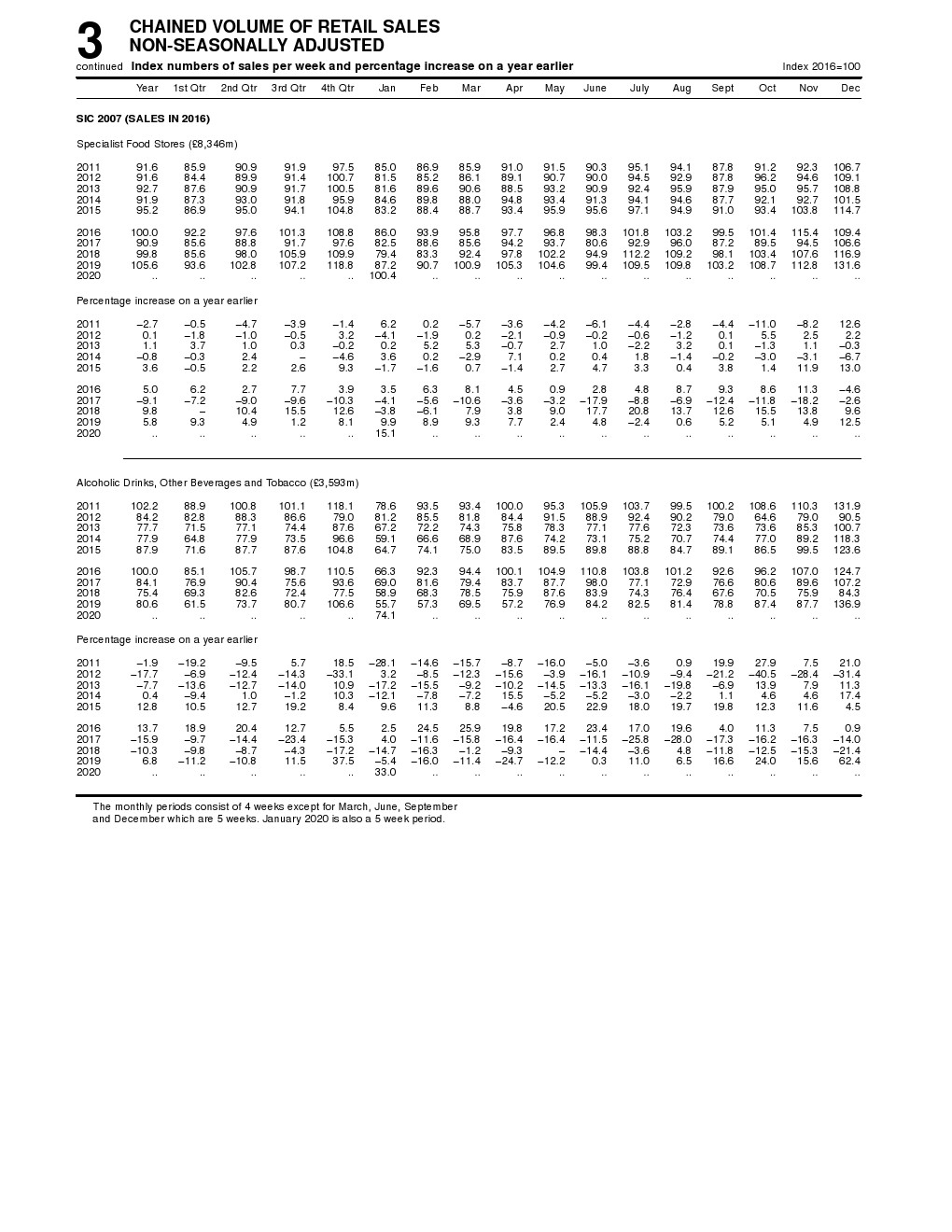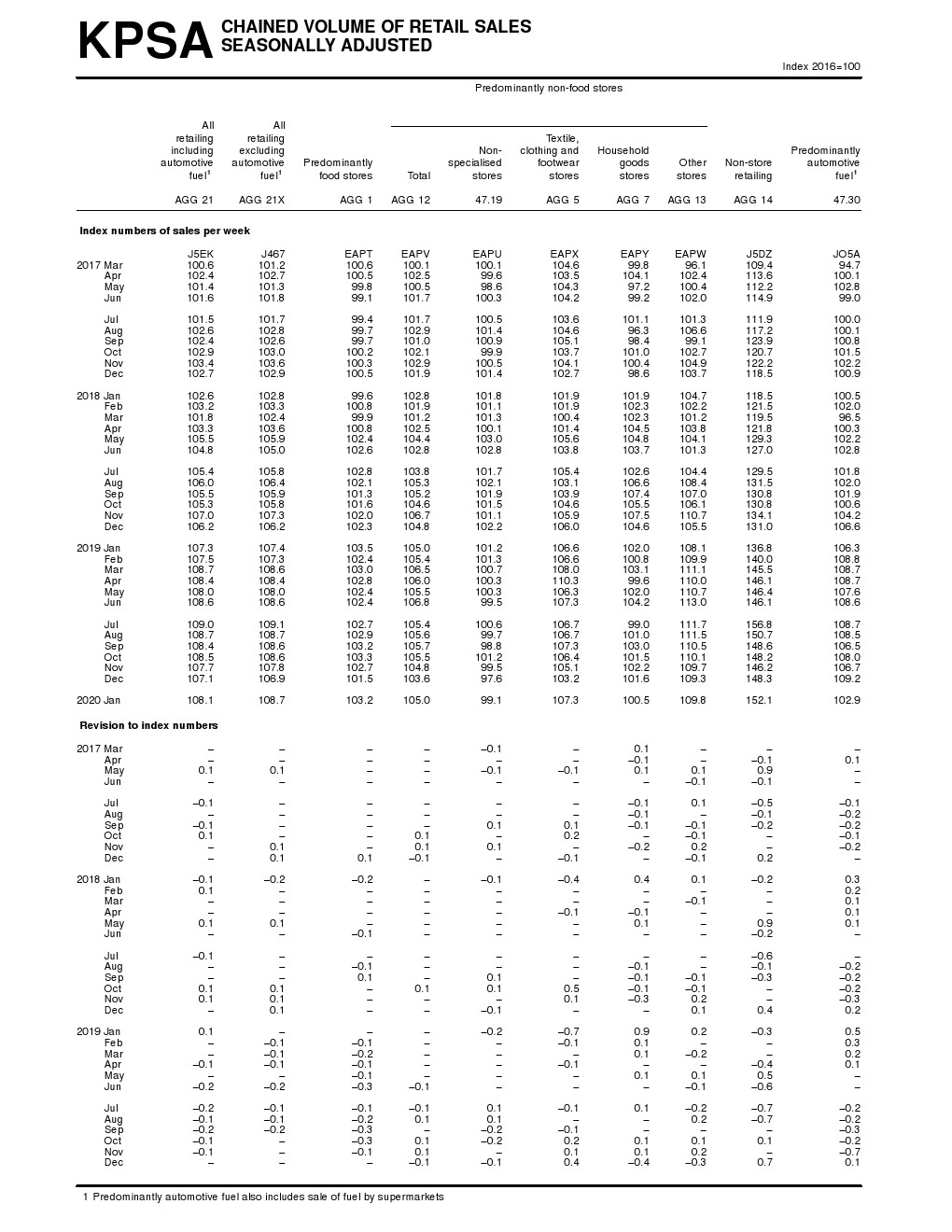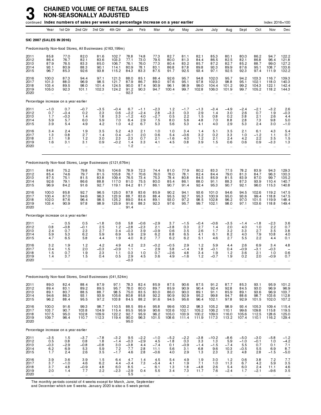 与2019年12月相比,2020年1月在线支出增长0.9%,其中食品店增长5.7%,非商店零售增长5.1%。非食品类商店出现6.8%的跌幅,很大程度上是由于百货公司(-4.8%)和家居用品商店(-26.7%)的大幅下降。这些商店在前一个月经历了强劲的增长,百货商店增长了16.9%,家居用品商店增长了19.6%。