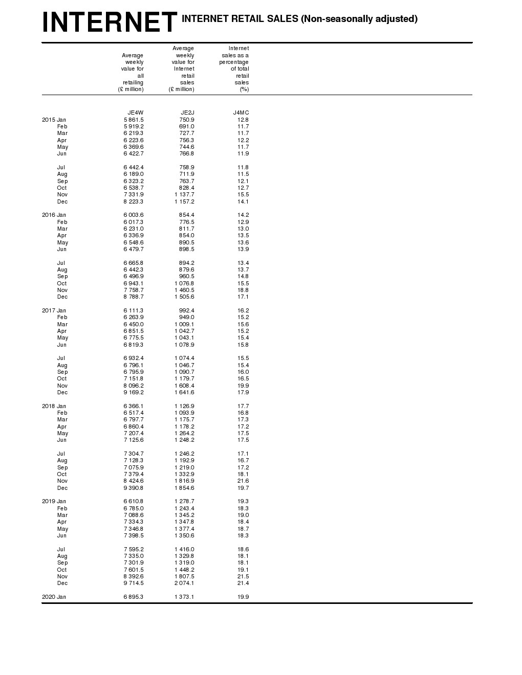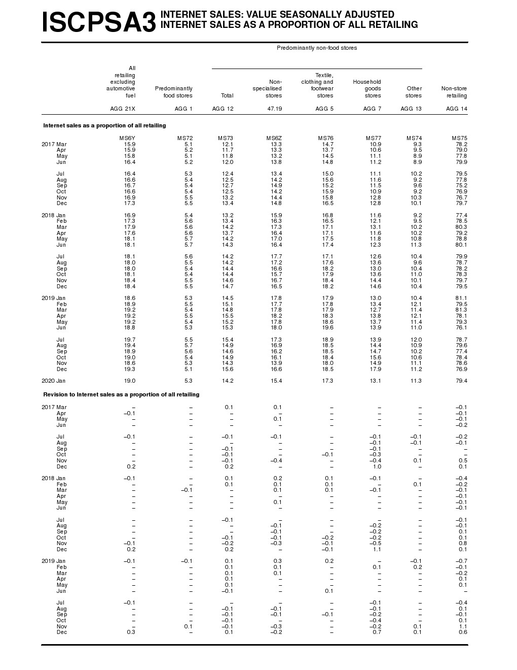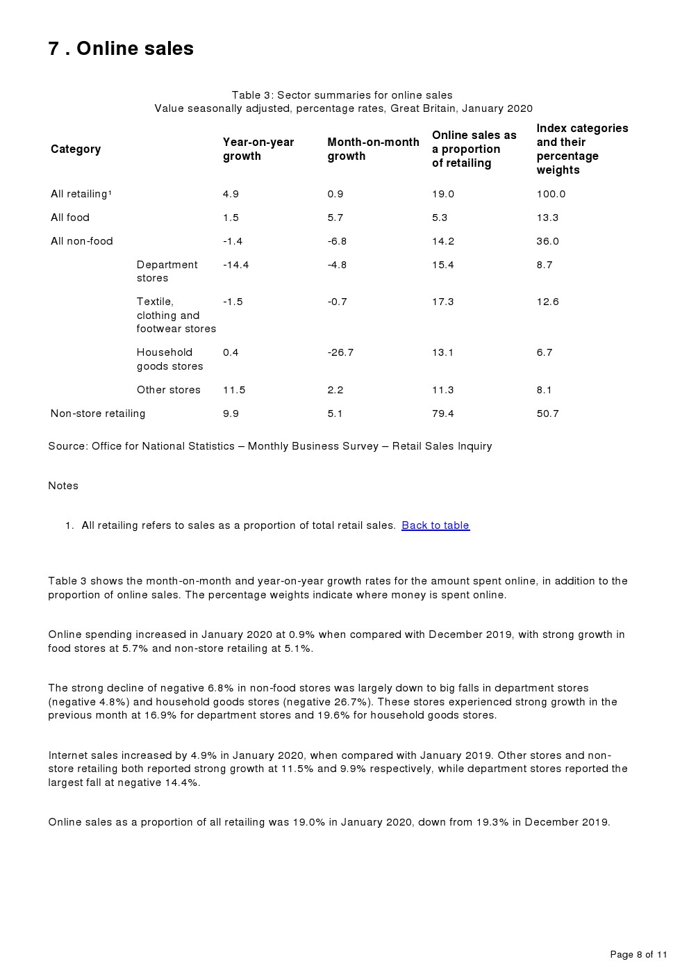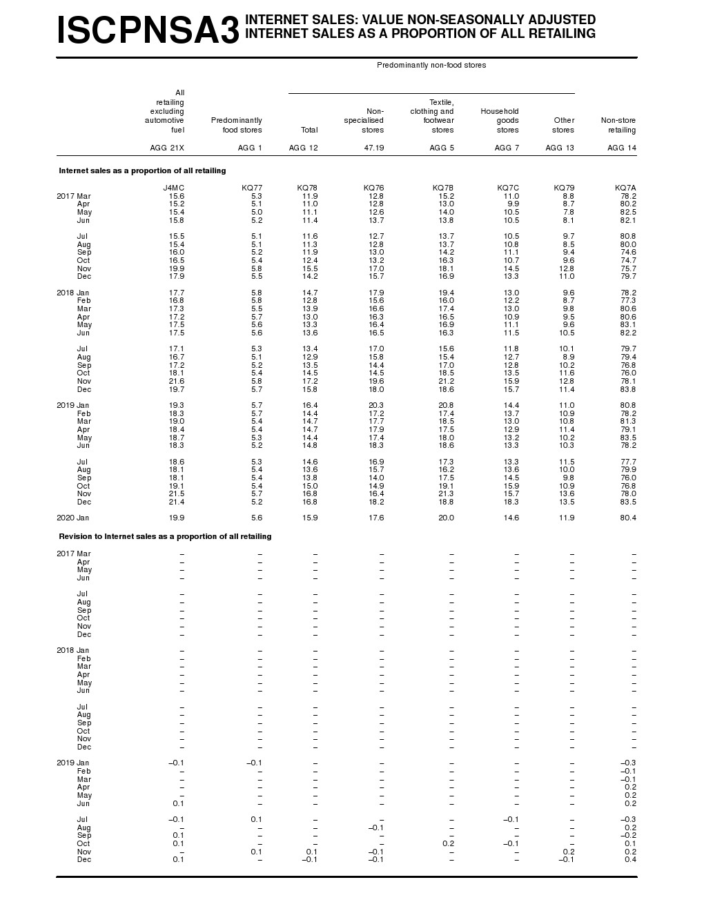 与2019年1月相比,2020年1月网络零售销售额增长了4.9%,其他商店和非商店零售也实现强劲增长,分别为11.5%和9.9%,而百货商店则经历了答复下降(14.4%)。2020年1月,在线销售额占所有零售销售额的19.0%,低于2019年12月(19.3%)。