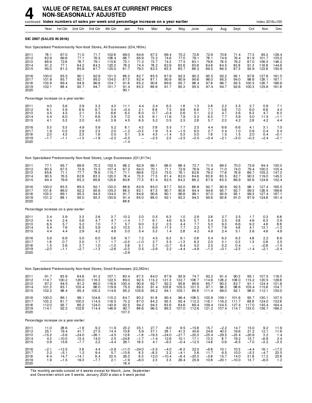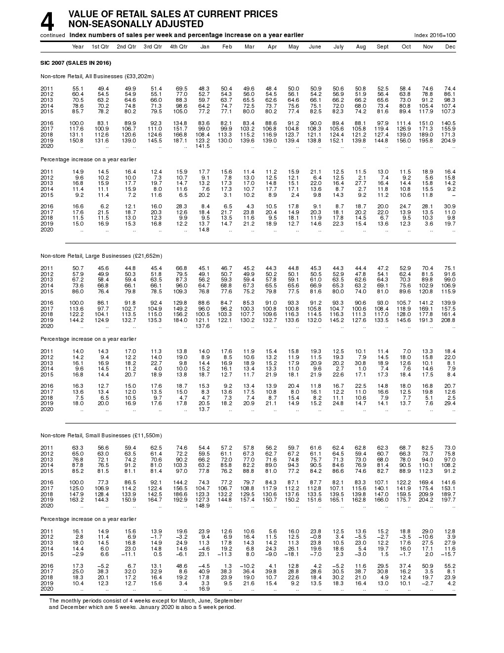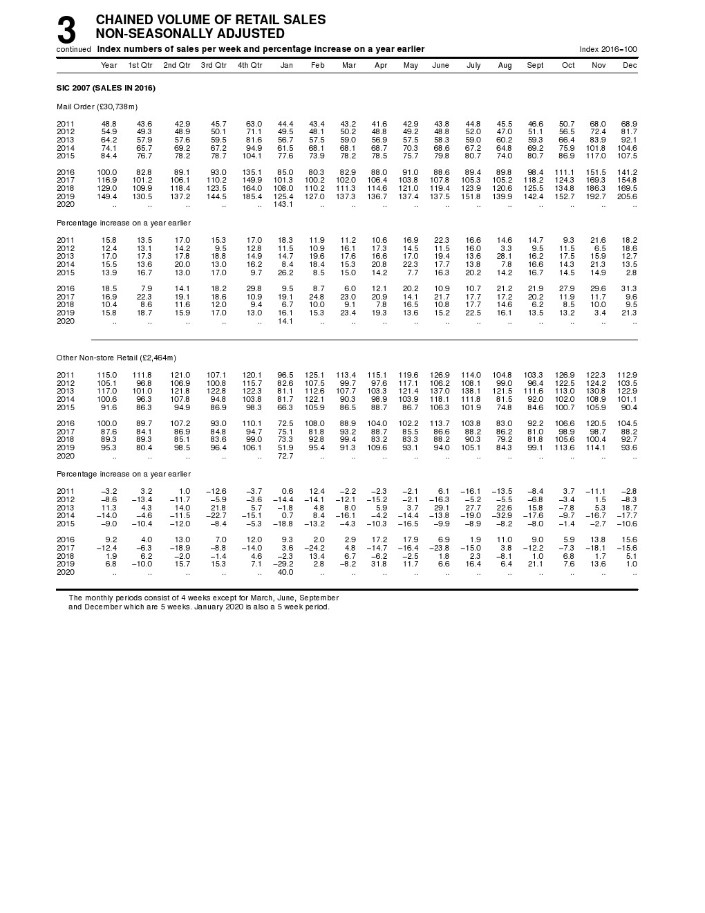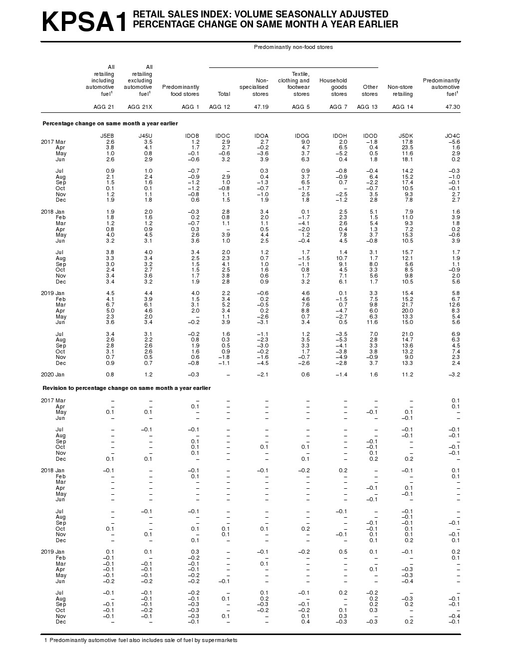 与2019年1月相比,2020年1月网络零售销售额增长了4.9%,其他商店和非商店零售也实现强劲增长,分别为11.5%和9.9%,而百货商店则经历了答复下降(14.4%)。2020年1月,在线销售额占所有零售销售额的19.0%,低于2019年12月(19.3%)。