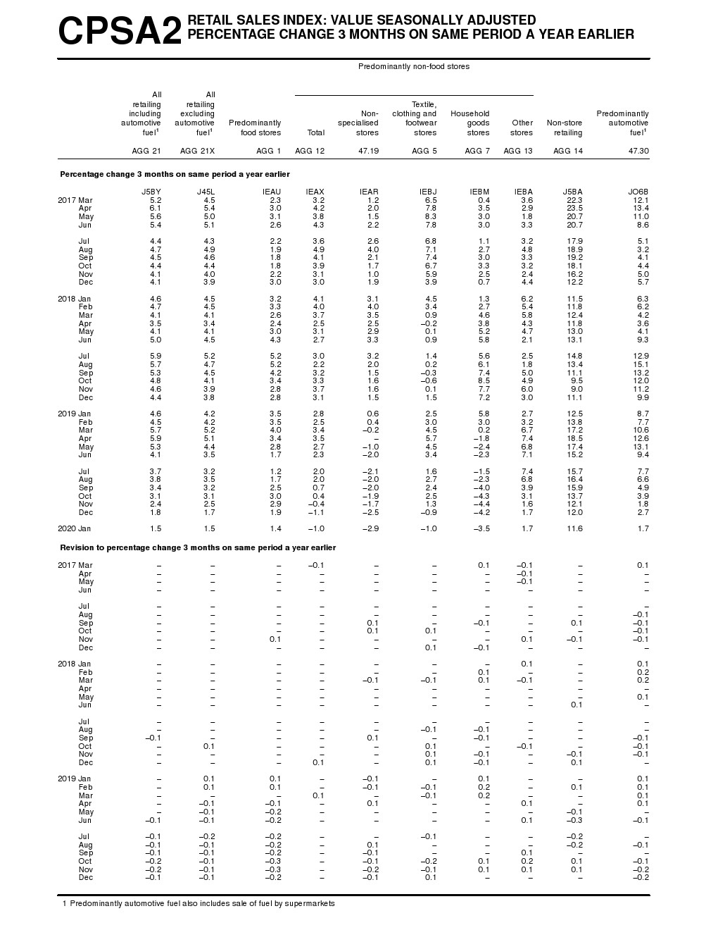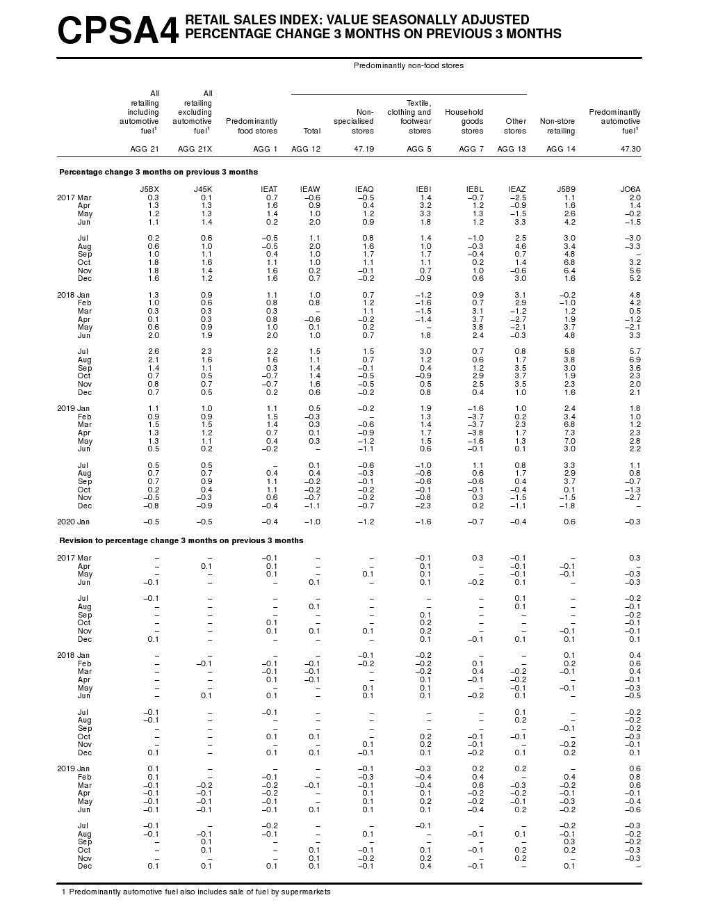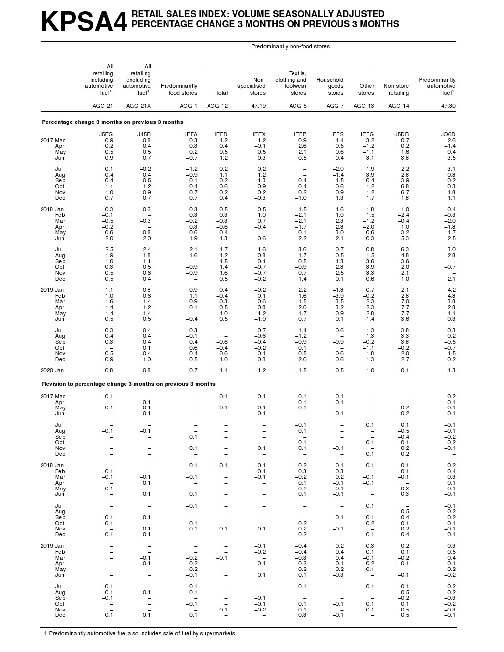 截至2020年1月的三个月,零售业消费额和购买量较前三个月分别下跌0.5%和0.8%。2020年1月的情况是消费额和购买量分别增长1.2%和0.9%。