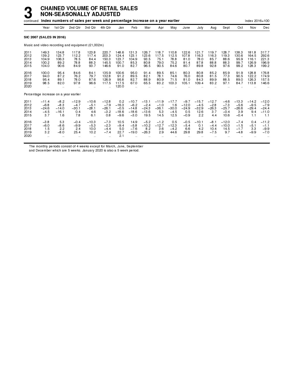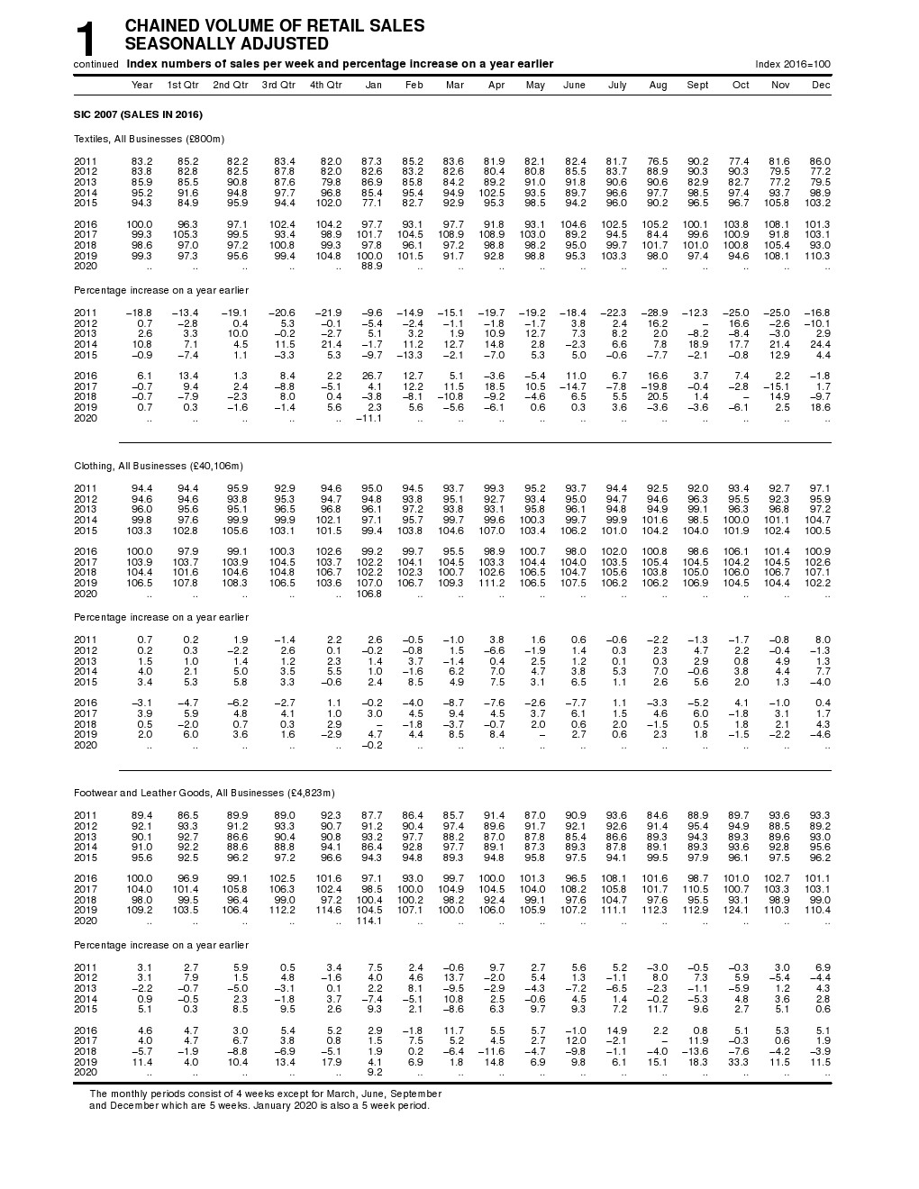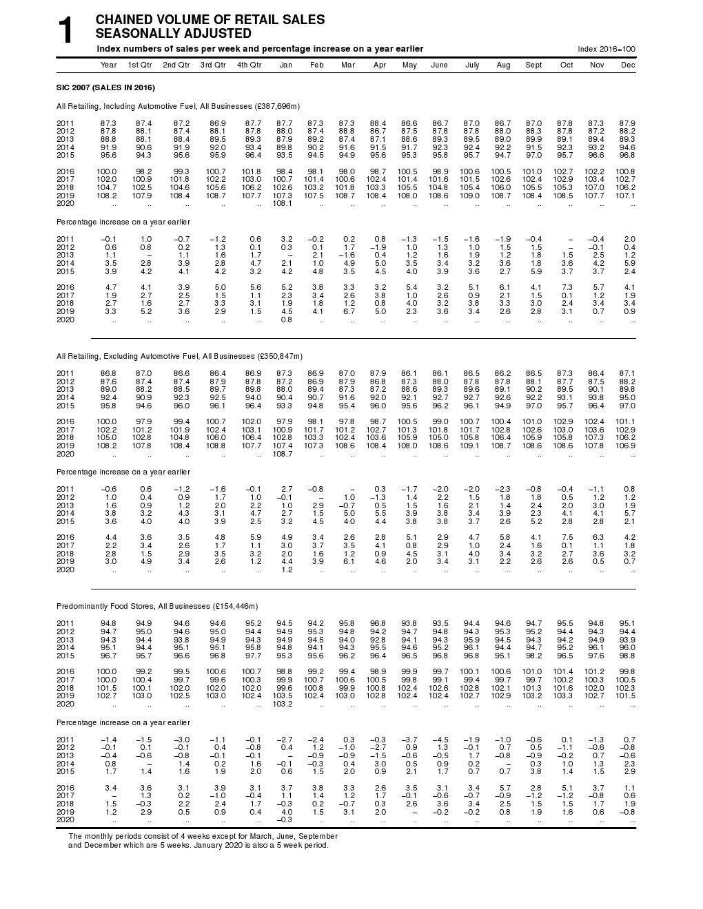 截至2020年1月的三个月,零售业消费额和购买量较前三个月分别下跌0.5%和0.8%。2020年1月的情况是消费额和购买量分别增长1.2%和0.9%。