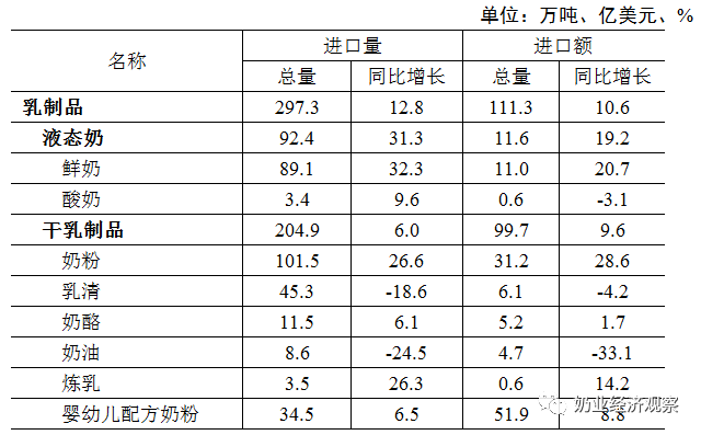 分品种来看,鲜奶和原料奶粉进口量都有较大增长,乳制品进口总量近300万吨,原料奶粉进口量首次突破100万吨,干乳制品进口量首次突破200万吨。具体来说: