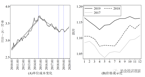 图2 规模养殖单位产量总成本及价格成本比的变动趋势