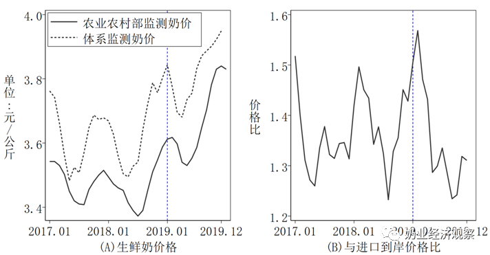 2019年,国内外奶业竞争力差距明显缩小。虽然国内生鲜奶收购价格依然高于进口奶粉折原料奶的到岸价格,但是由于国外乳制品价格和中国进口到岸价格的上升,两者的比值有大幅下降(见图1B)。2019年1~12月,进口奶粉折原料奶的平均到岸价格从2.40元/公斤升至2.93元/公斤,国内生鲜奶收购价与进口奶粉折原料奶的到岸价格相比,从高出37.6%降到仅高16.0%。