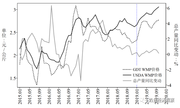 图7 国际市场乳制品价格及主要国家和地区的产量变化